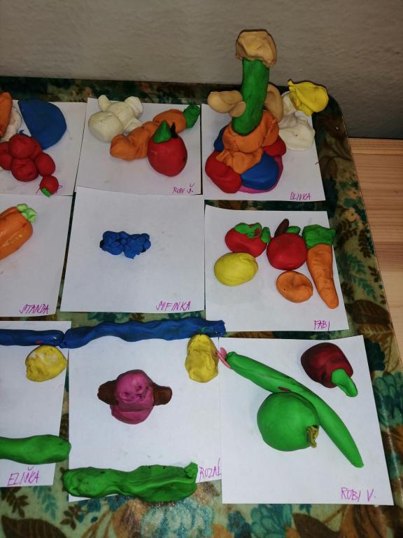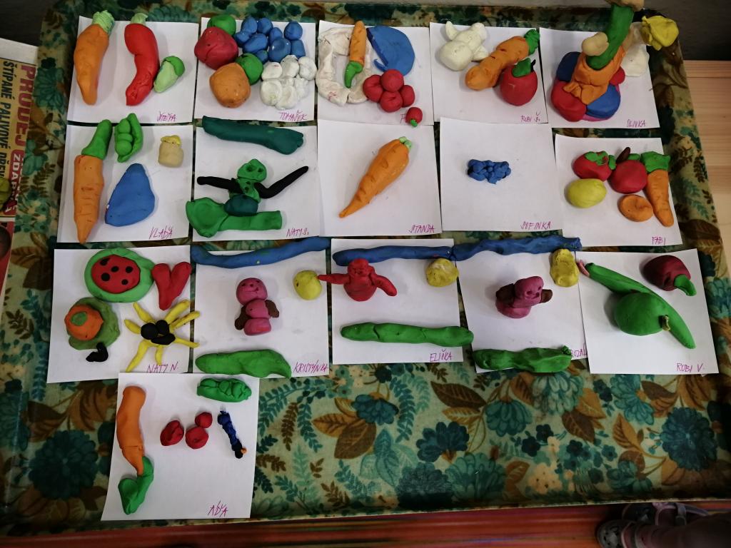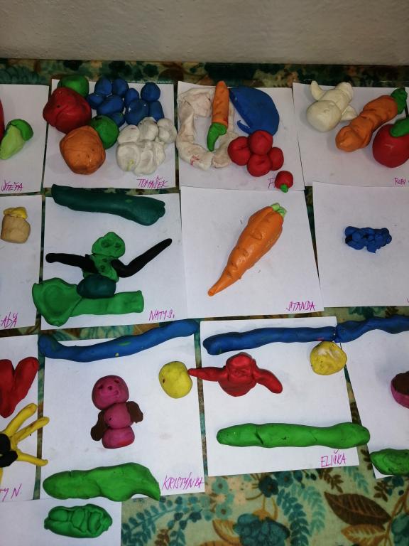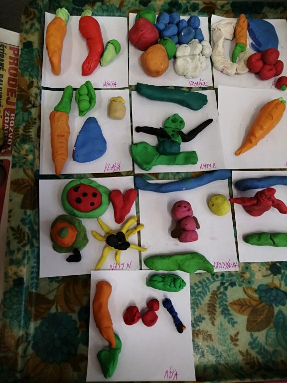 Co nás ale nejvíce nadchlo, to byla práce s modelínou. Těch věcí co jde s ní dělat! Mačkat, válet, stříhat, píchat do ní, otiskovat - už se těšíme na další práci s ní.
