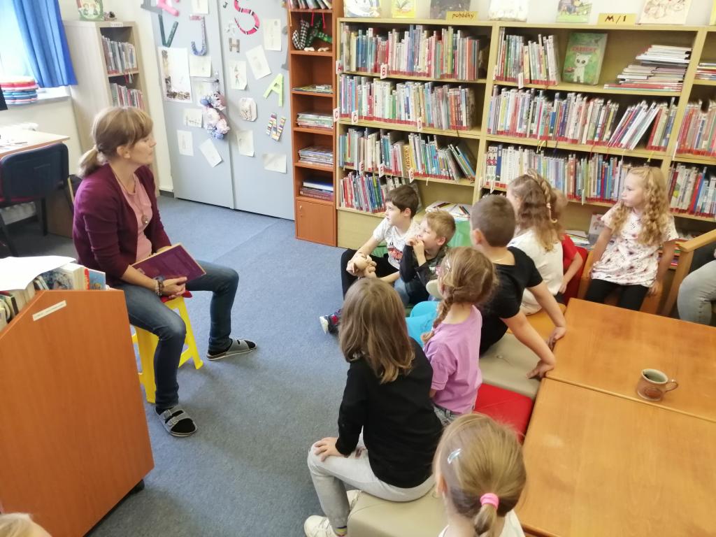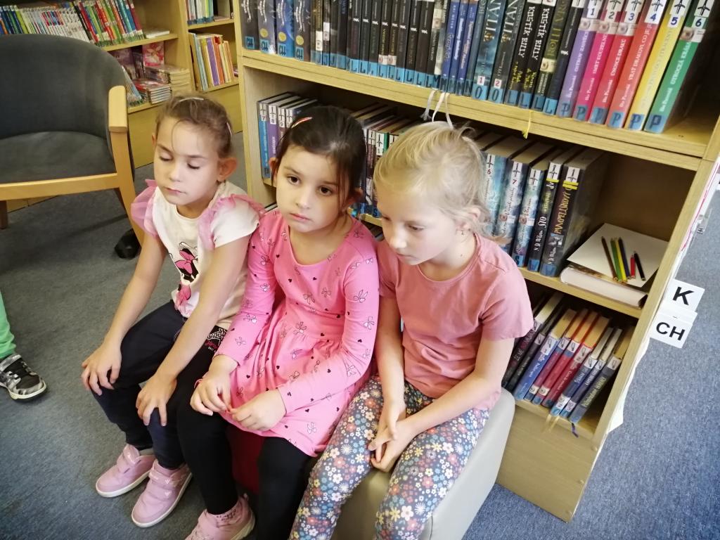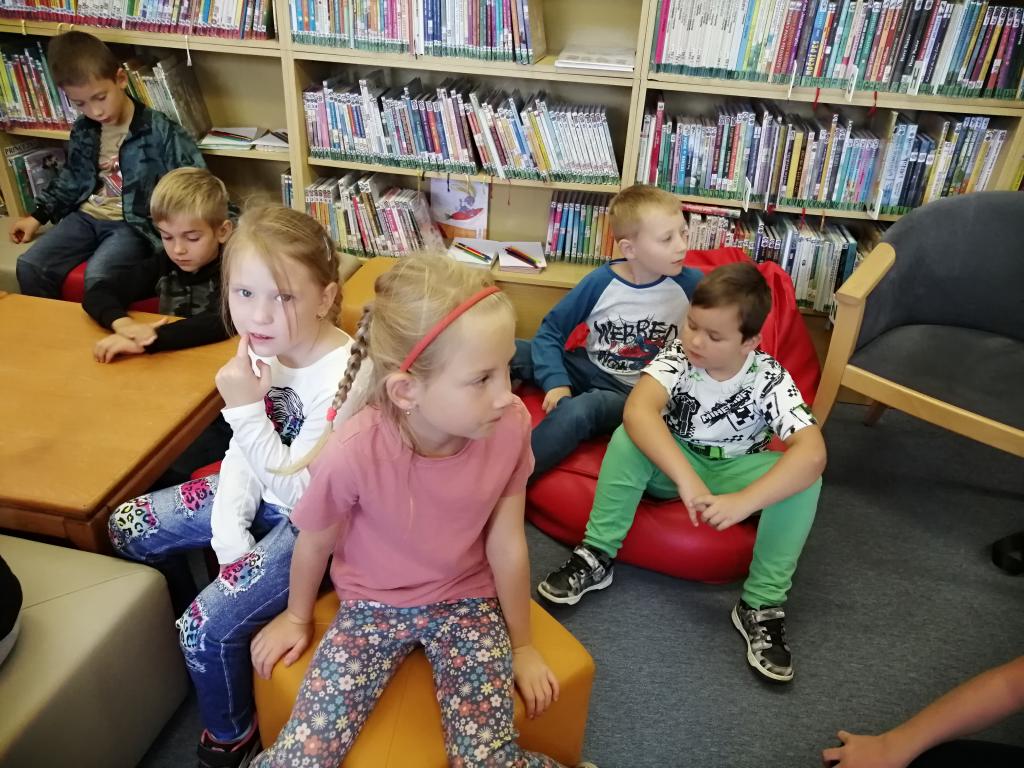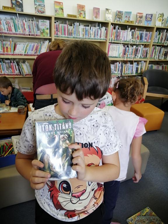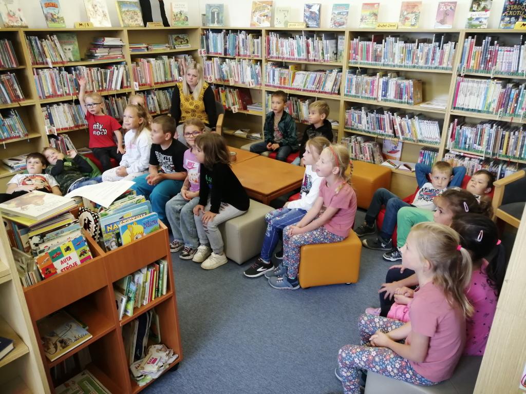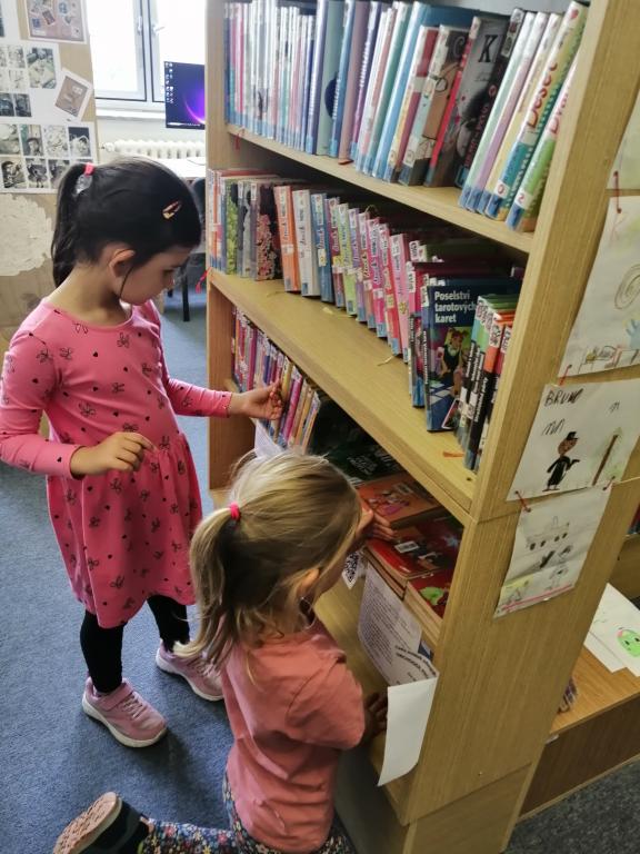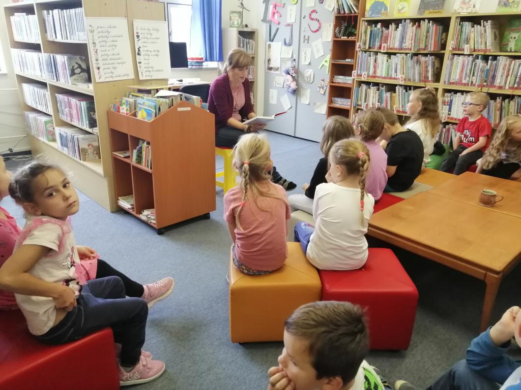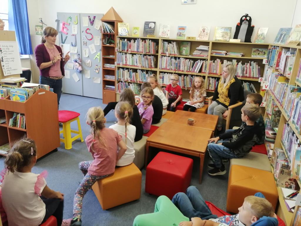 Navštívili jsme také knihovnu. Tam se nám moc líbilo. Někteří z nás to tam znají, jiní tam byli aspoň jednou se školkou. Všichni ale s jistotou známe paní knihovnici, protože ta za námi každý měsíc chodila s programem do školky. Teď už jsme velcí, tak budeme každý měsíc chodit za ní do knihovny my. Zatím ji budeme navštěvovat v provizorní budově knihovny, ale už se těšíme, až bude dostavěna nová budova s většími prostory a budeme chodit tam. A pokud se naučíme číst, jako že my to určitě zvládneme, na konci první třídy nás král Písmenkové říše pasuje na čtenáře.