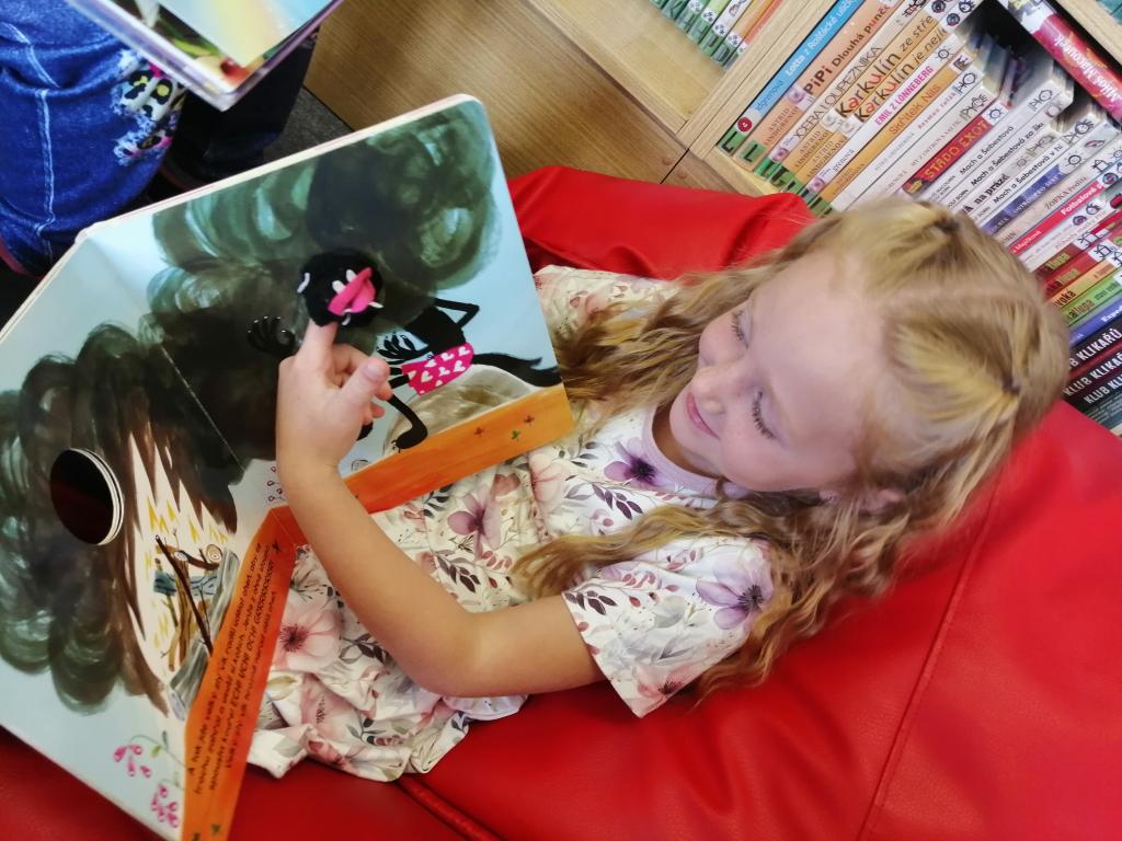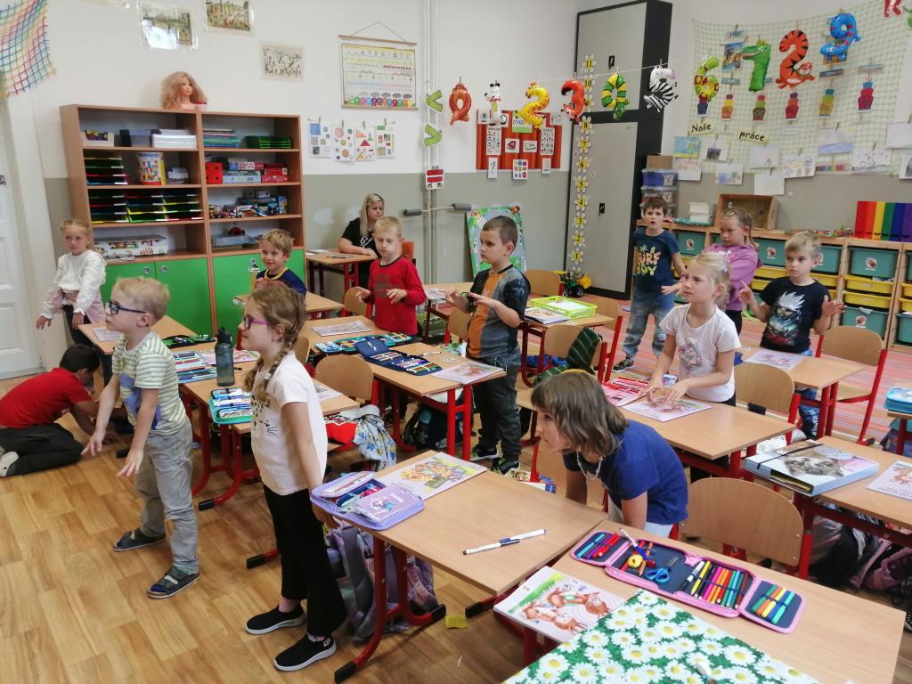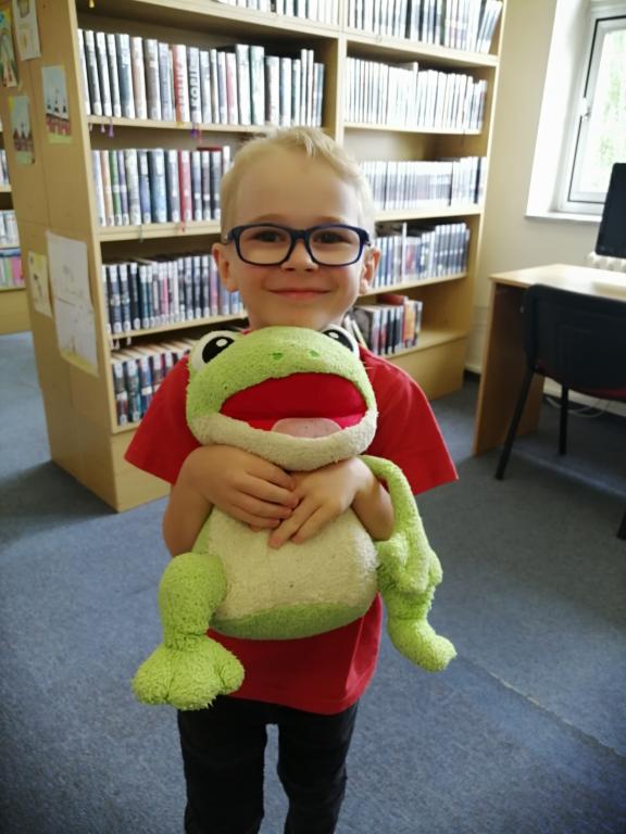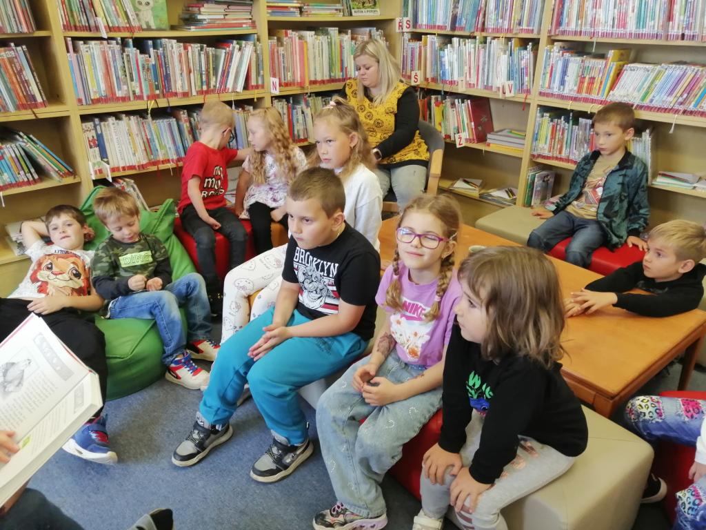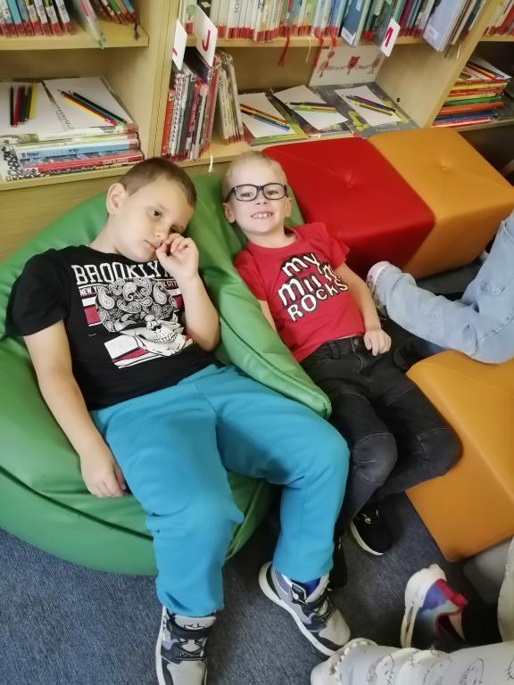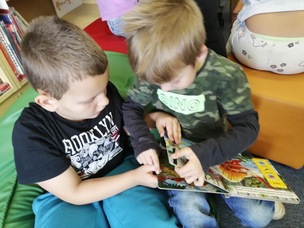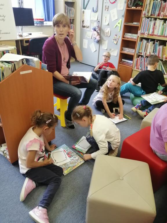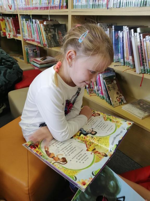 Navštívili jsme také knihovnu. Tam se nám moc líbilo. Někteří z nás to tam znají, jiní tam byli aspoň jednou se školkou. Všichni ale s jistotou známe paní knihovnici, protože ta za námi každý měsíc chodila s programem do školky. Teď už jsme velcí, tak budeme každý měsíc chodit za ní do knihovny my. Zatím ji budeme navštěvovat v provizorní budově knihovny, ale už se těšíme, až bude dostavěna nová budova s většími prostory a budeme chodit tam. A pokud se naučíme číst, jako že my to určitě zvládneme, na konci první třídy nás král Písmenkové říše pasuje na čtenáře.