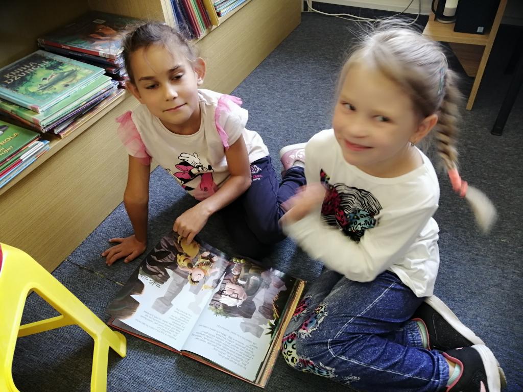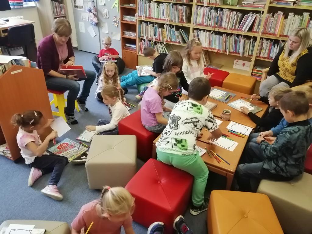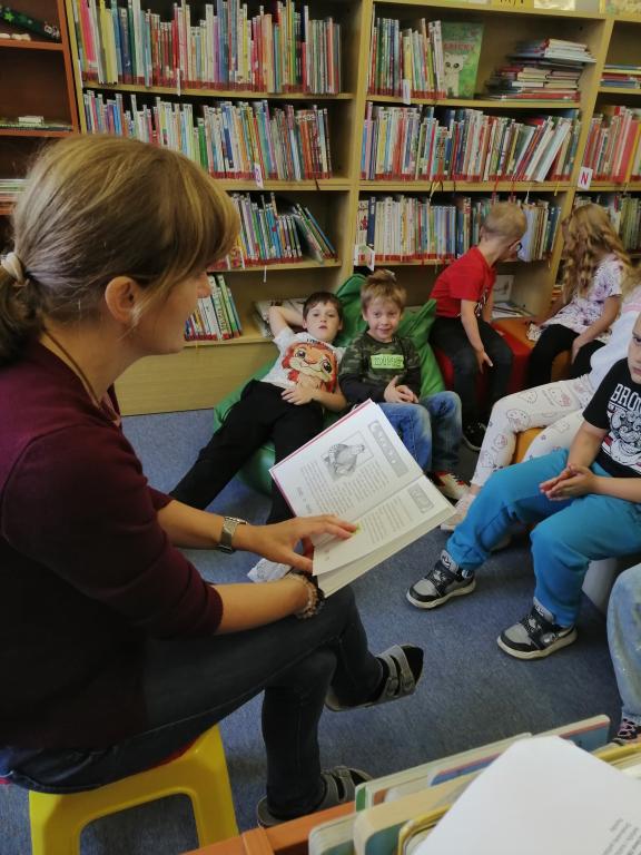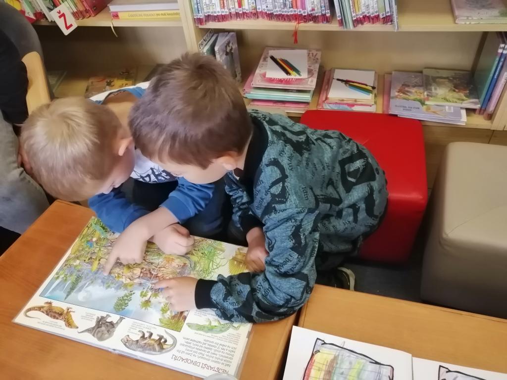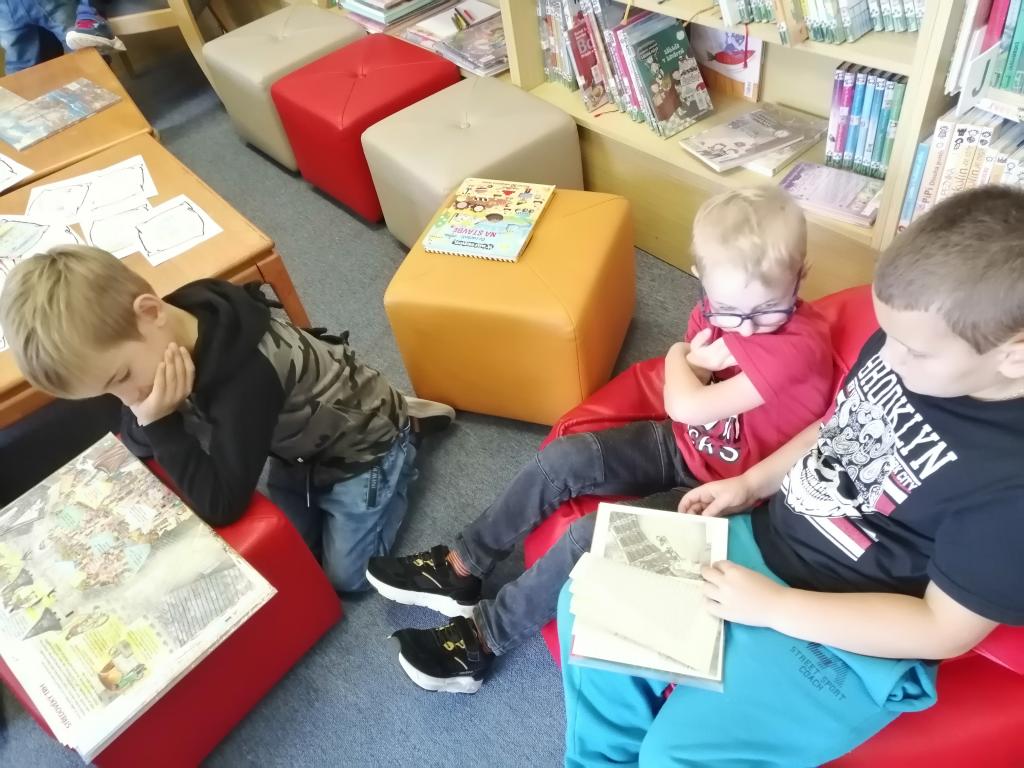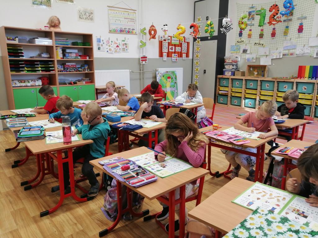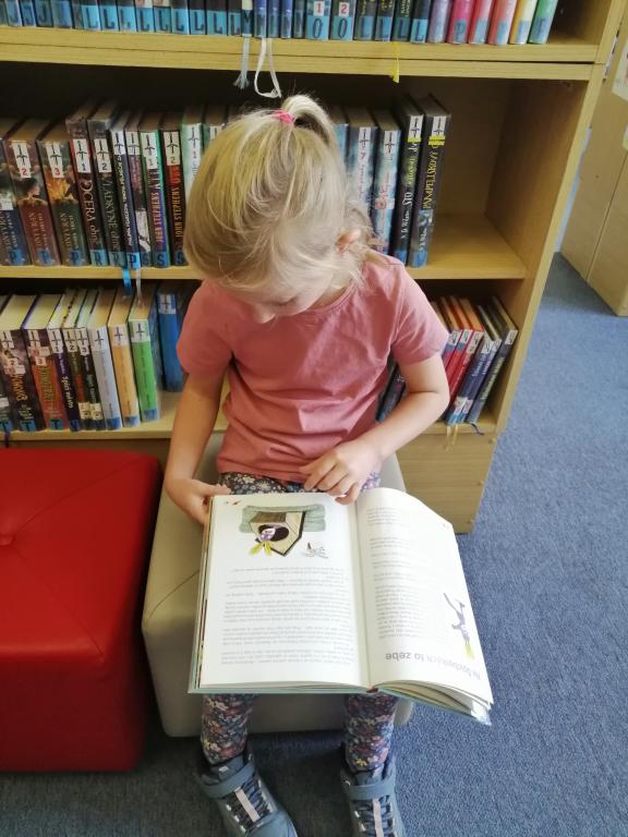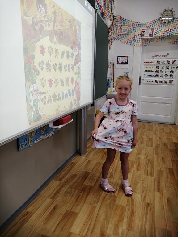 Navštívili jsme také knihovnu. Tam se nám moc líbilo. Někteří z nás to tam znají, jiní tam byli aspoň jednou se školkou. Všichni ale s jistotou známe paní knihovnici, protože ta za námi každý měsíc chodila s programem do školky. Teď už jsme velcí, tak budeme každý měsíc chodit za ní do knihovny my. Zatím ji budeme navštěvovat v provizorní budově knihovny, ale už se těšíme, až bude dostavěna nová budova s většími prostory a budeme chodit tam. A pokud se naučíme číst, jako že my to určitě zvládneme, na konci první třídy nás král Písmenkové říše pasuje na čtenáře.