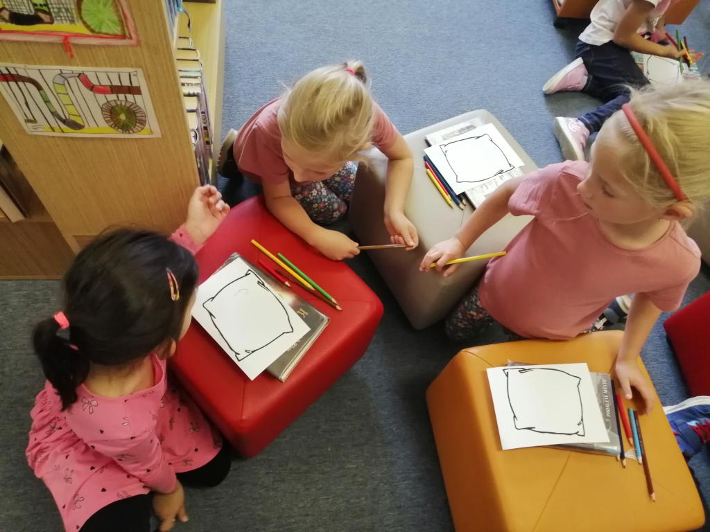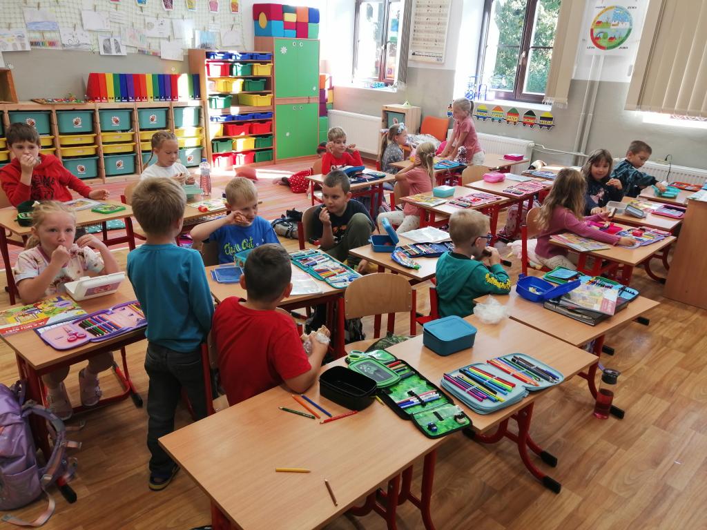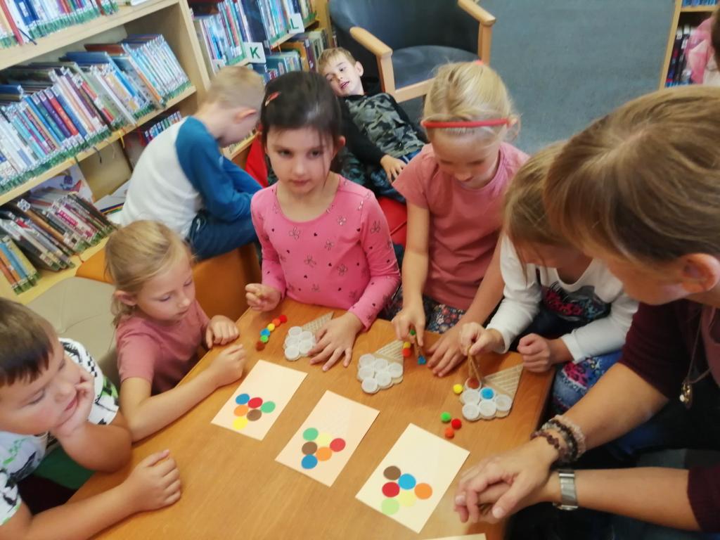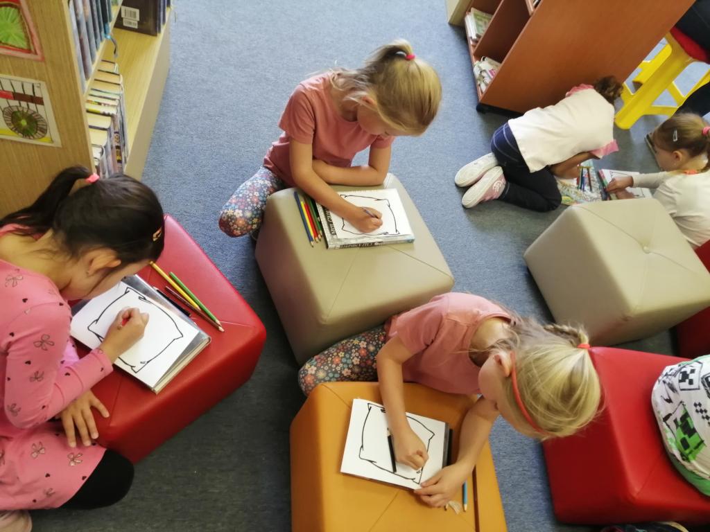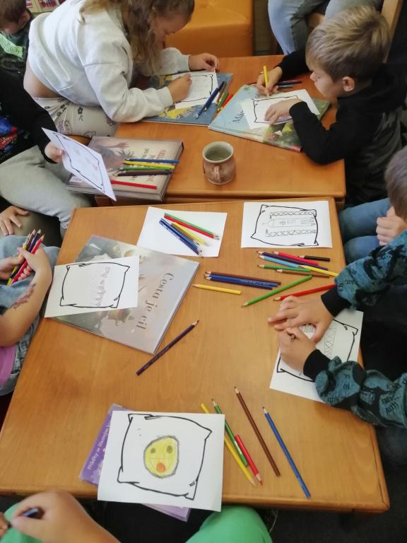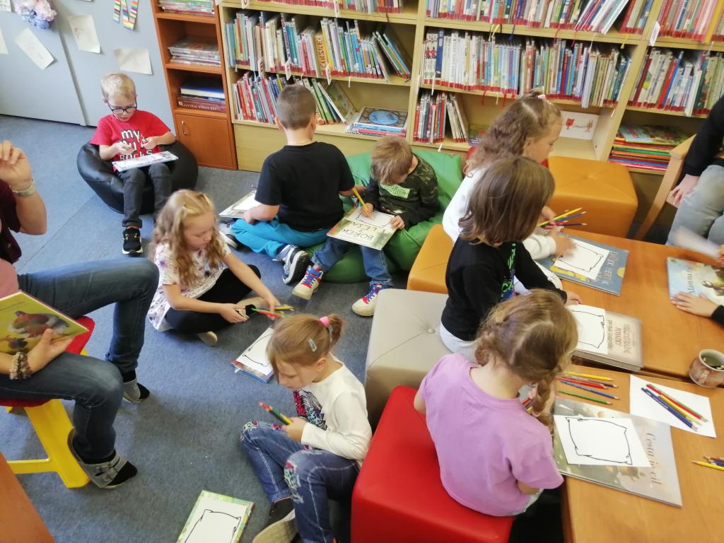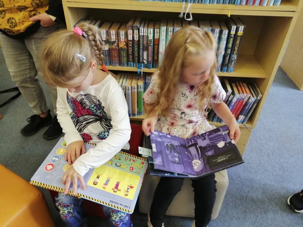 Navštívili jsme také knihovnu. Tam se nám moc líbilo. Někteří z nás to tam znají, jiní tam byli aspoň jednou se školkou. Všichni ale s jistotou známe paní knihovnici, protože ta za námi každý měsíc chodila s programem do školky. Teď už jsme velcí, tak budeme každý měsíc chodit za ní do knihovny my. Zatím ji budeme navštěvovat v provizorní budově knihovny, ale už se těšíme, až bude dostavěna nová budova s většími prostory a budeme chodit tam. A pokud se naučíme číst, jako že my to určitě zvládneme, na konci první třídy nás král Písmenkové říše pasuje na čtenáře.