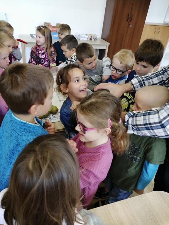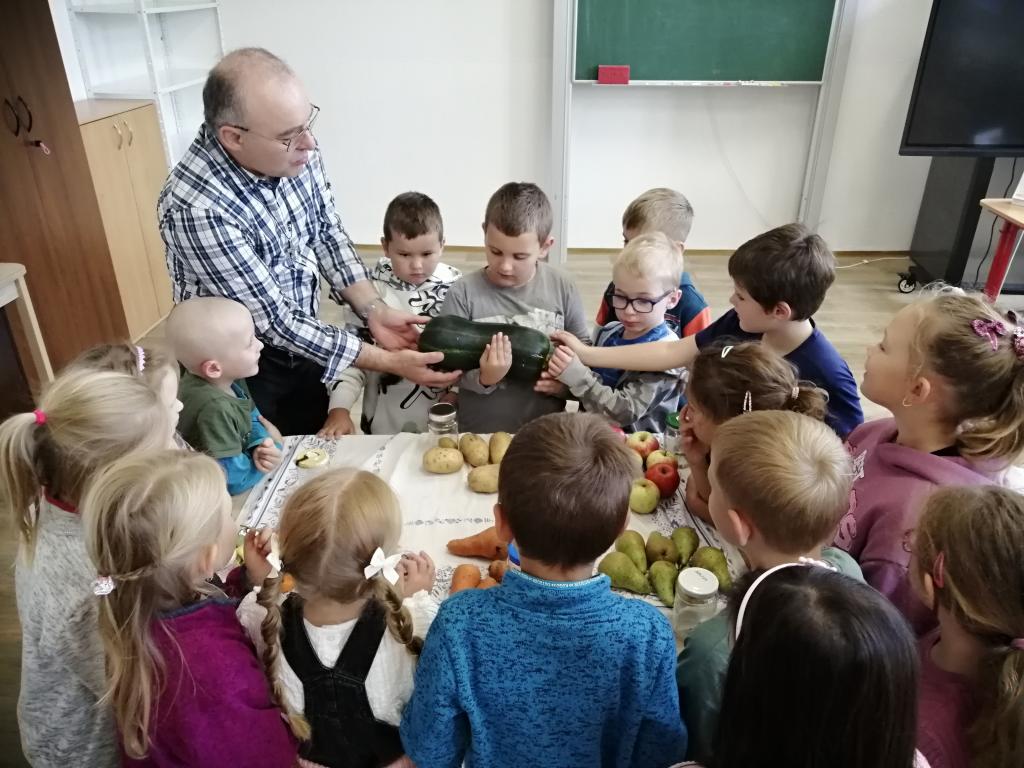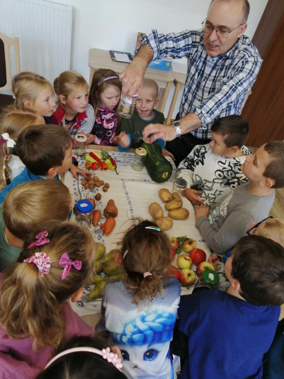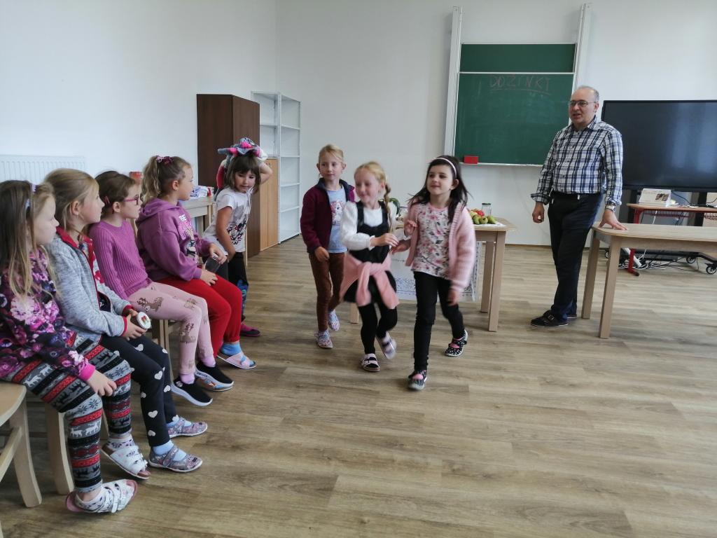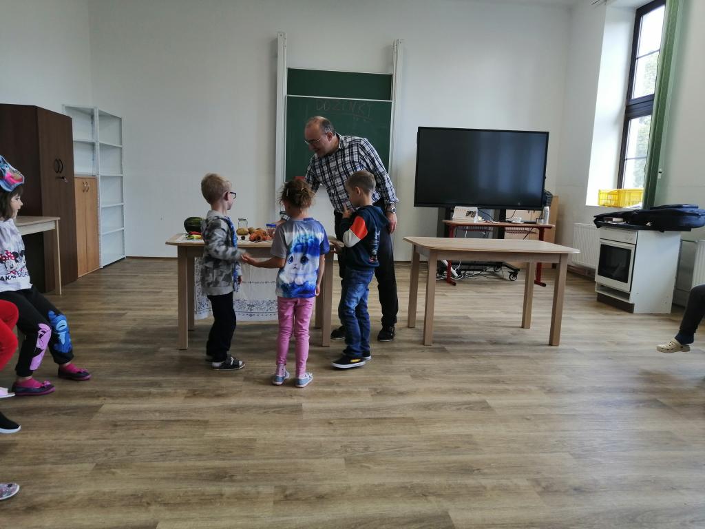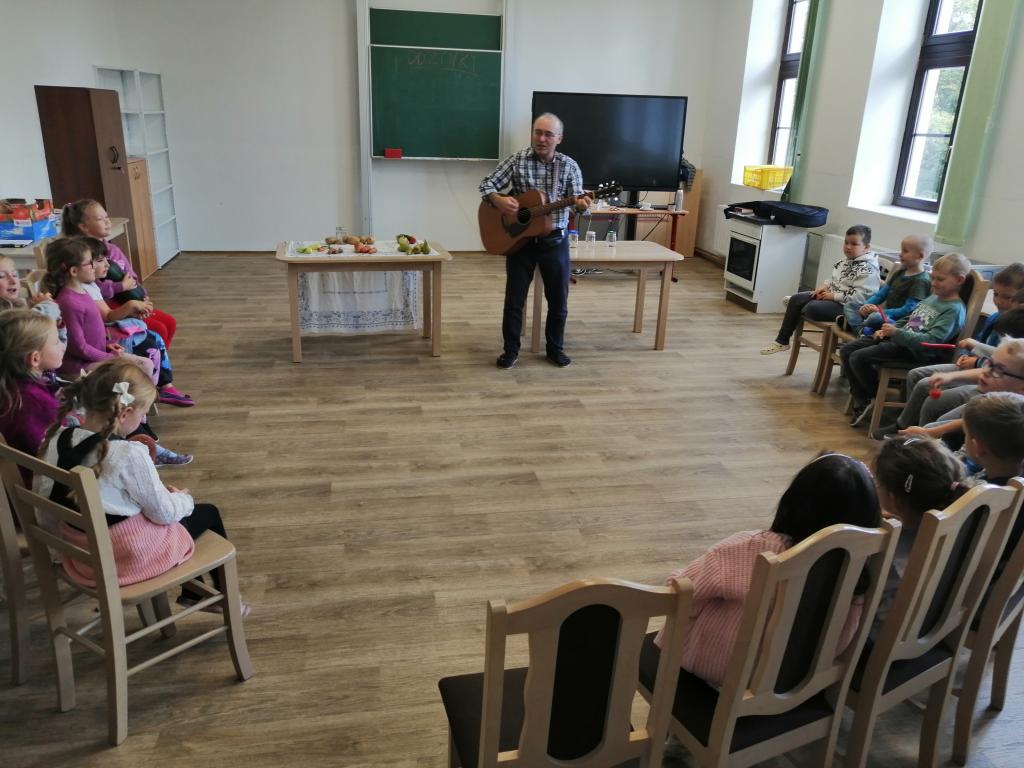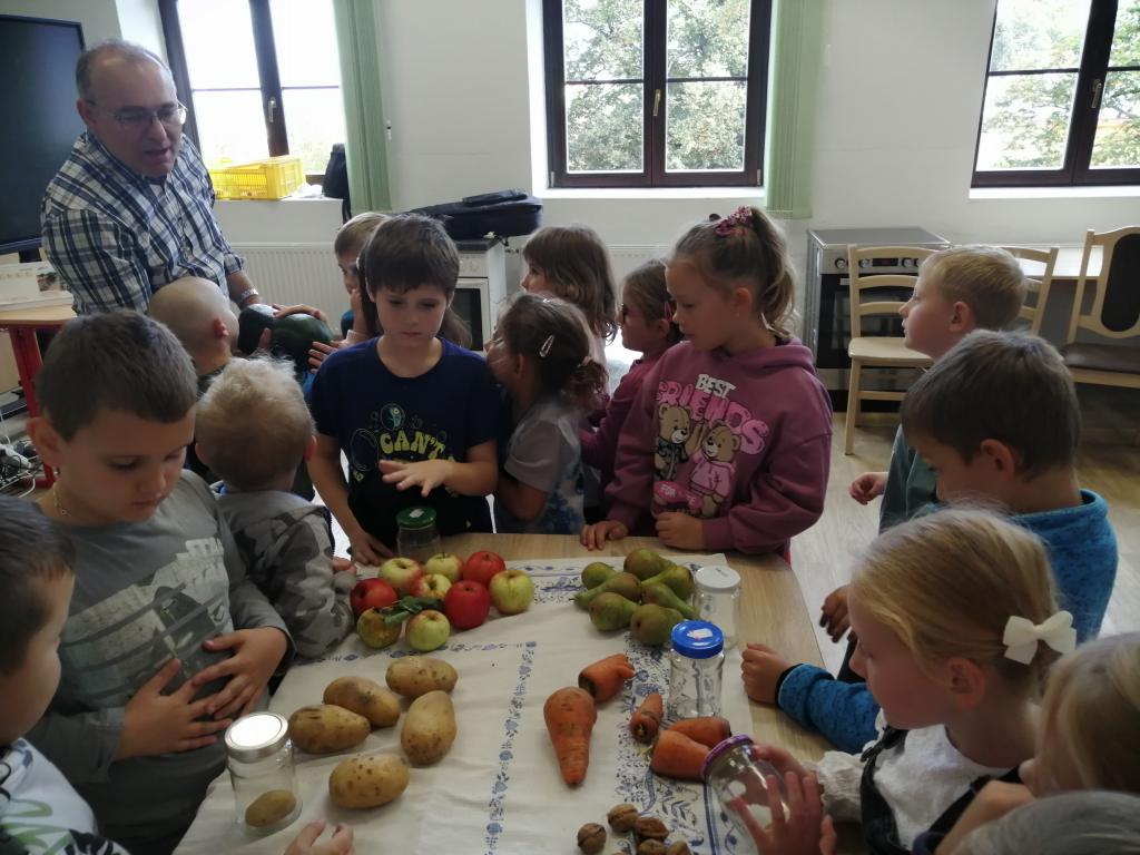 Svým programem o jídle nás obohatil i P. Matula. Dozvěděli jsme se, z čeho se vypěstují různé plody, s kterými se můžeme setkat na zahrádce, a jak je lze zužitkovat. Na závěr jsme si zazpívali písničku.