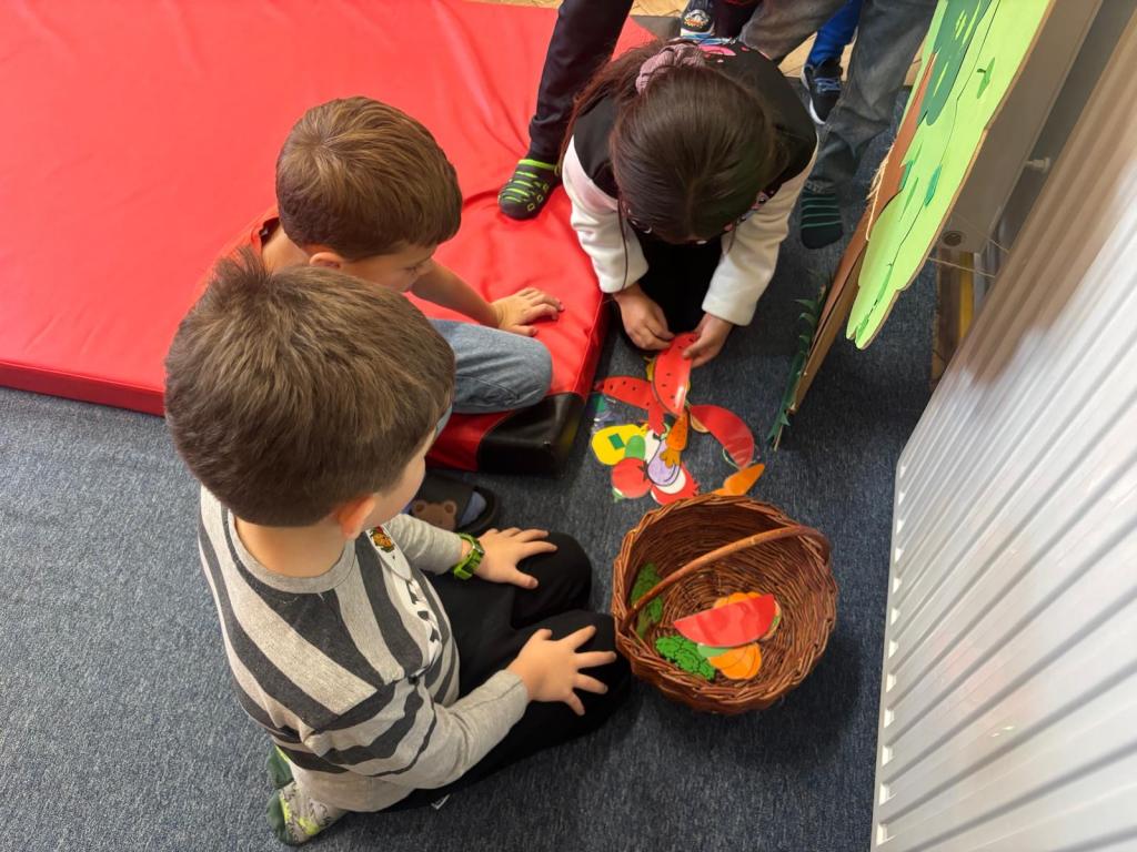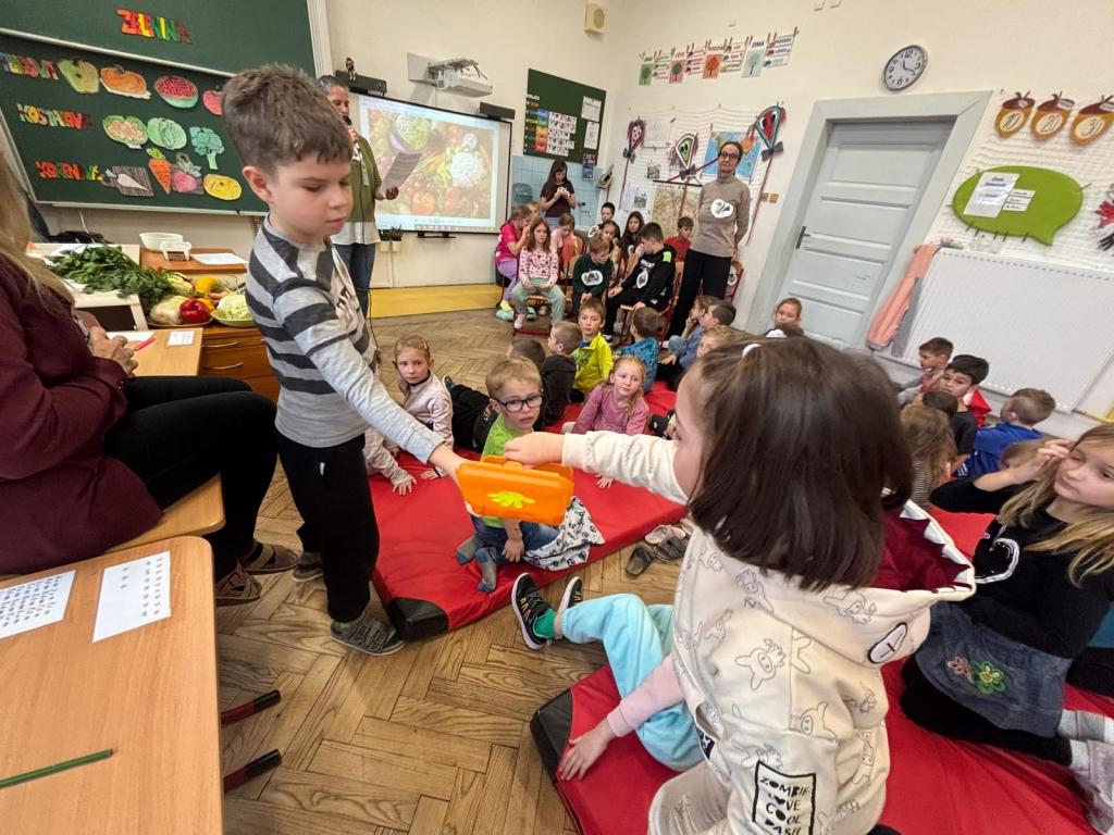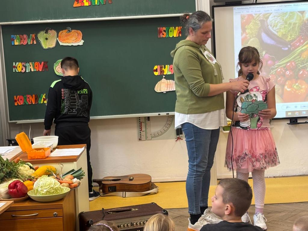 Projekt začal hádankovou písničkou. Následovaly informace a zajímavosti o zelenině a její dělení na jednotlivé druhy: listová, plodová, kořenová, košťálová a cibulová. Dozvěděli jsme se, jak krájet cibuli, abychom tolik nebrečeli, jak a jaké části ze zeleniny zpracujeme a mnoho dalšího. Následovaly otázky, správné odpovědi byly odměněny lahodnou zeleninou. Pak se děti vydaly plnit jednotlivé úkoly na stanoviště. Třídily zeleninu a ovoce, rozřazovaly zeleninu podle druhů, obtahovaly jedním tahem obrázky zeleniny a pak kreslily, poznávaly ji po hmatu.