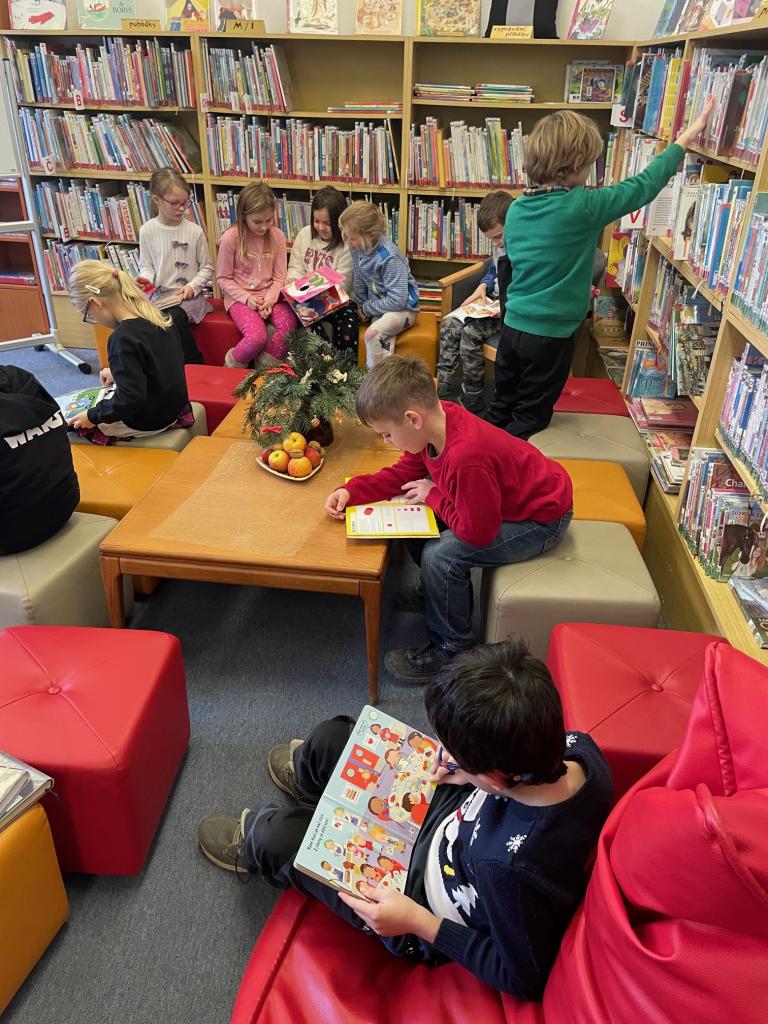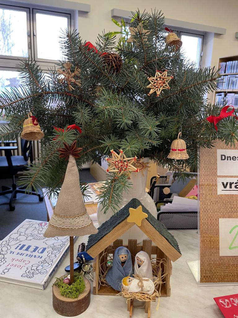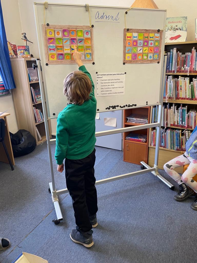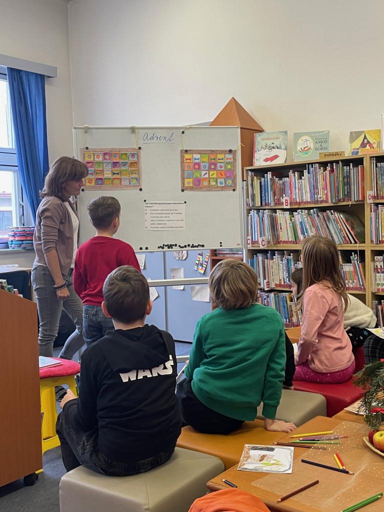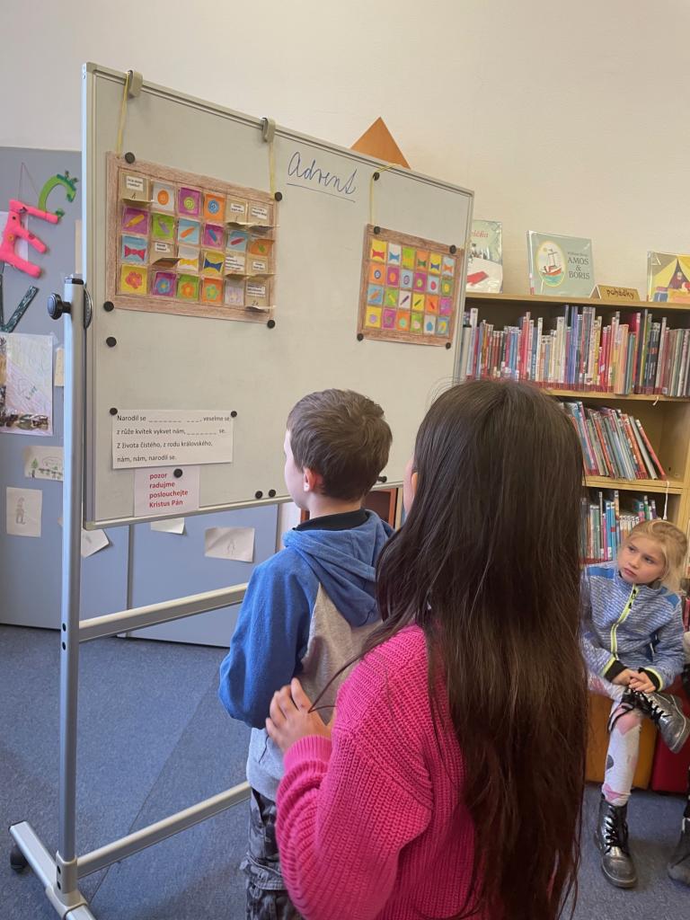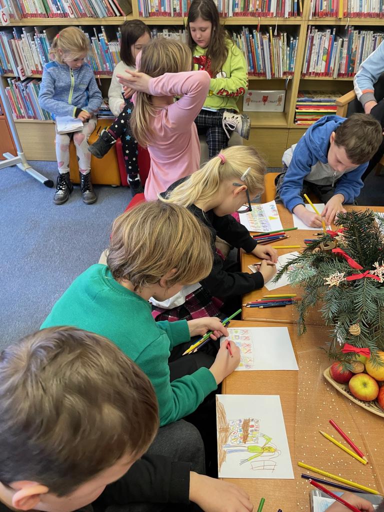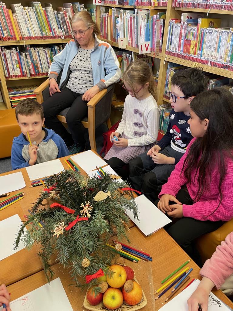 Příběh o Vánocích, adventní kalendář plný úkolů a koled, krelení, prohlížení, vypravování. Taková byla naše poslení návštěva v náhradních prostorách knihovny.