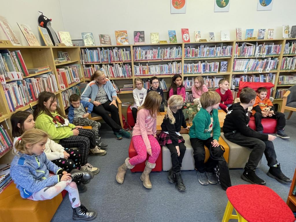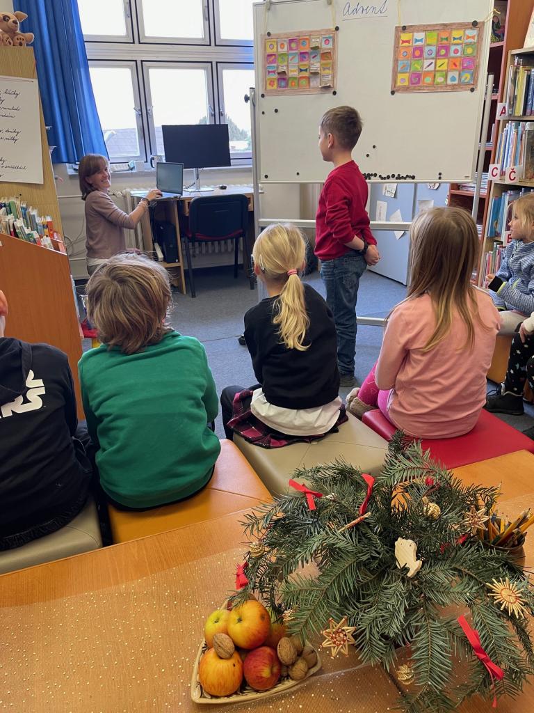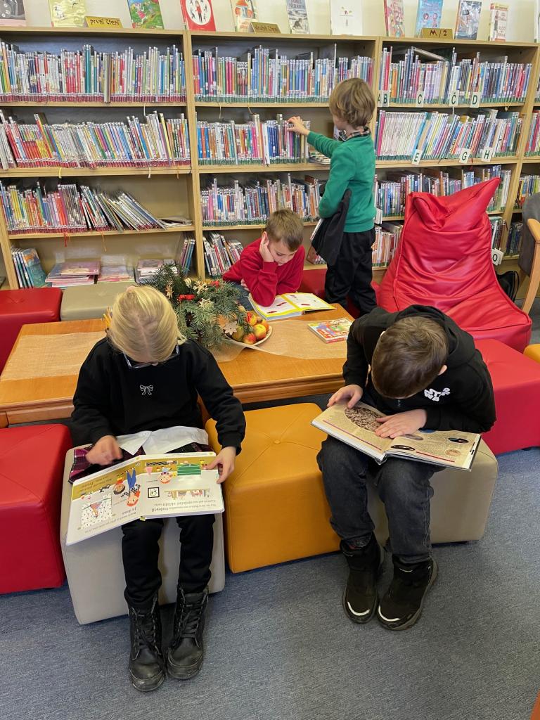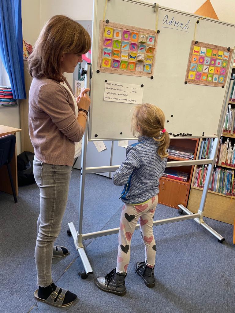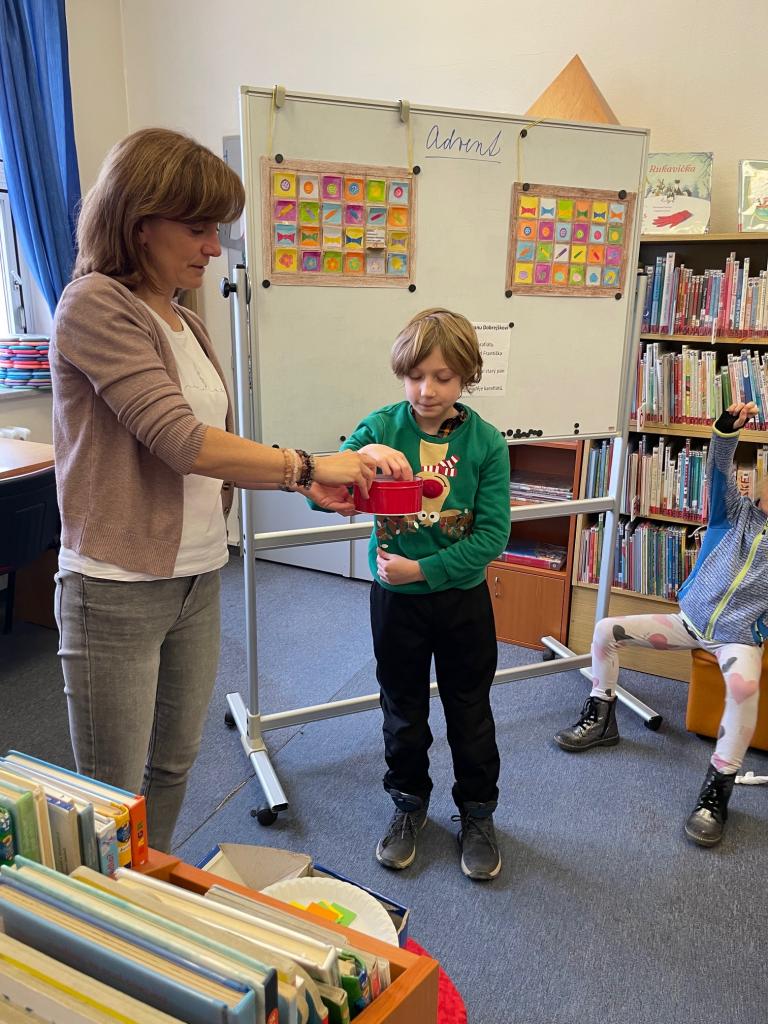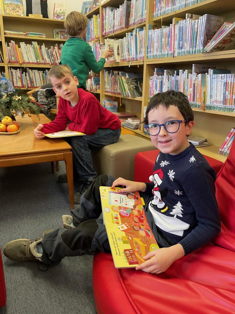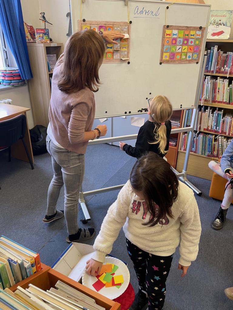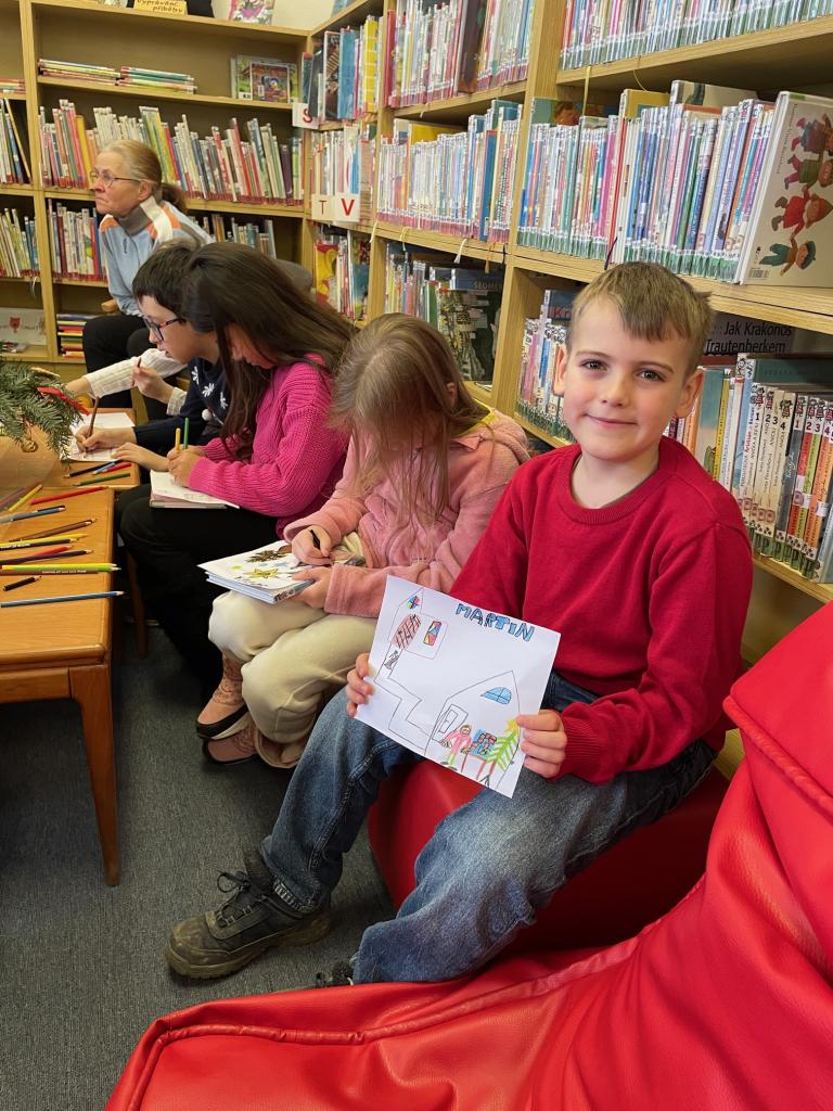 Příběh o Vánocích, adventní kalendář plný úkolů a koled, krelení, prohlížení, vypravování. Taková byla naše poslení návštěva v náhradních prostorách knihovny.