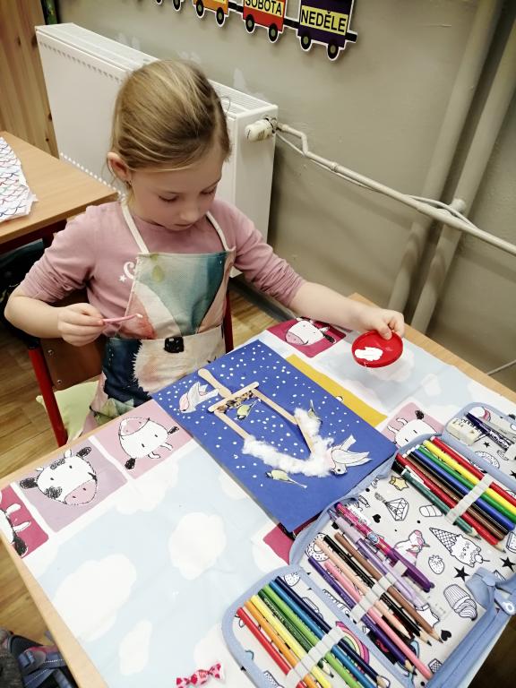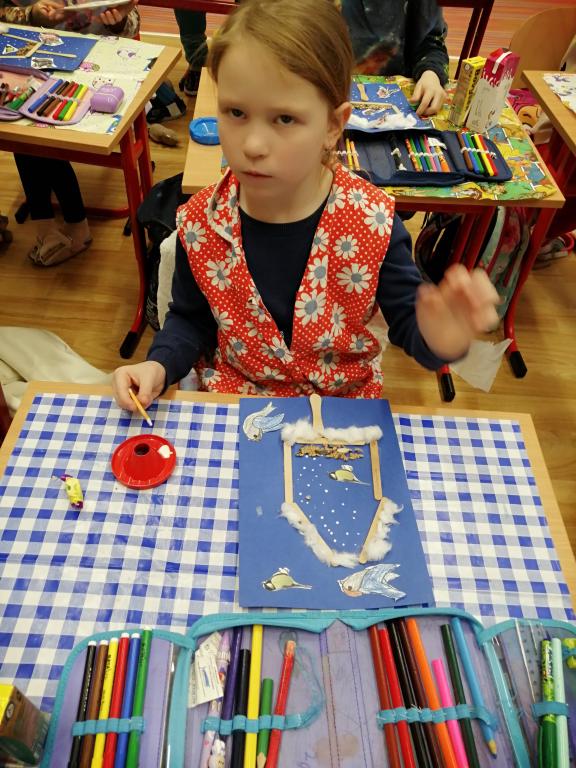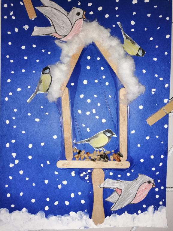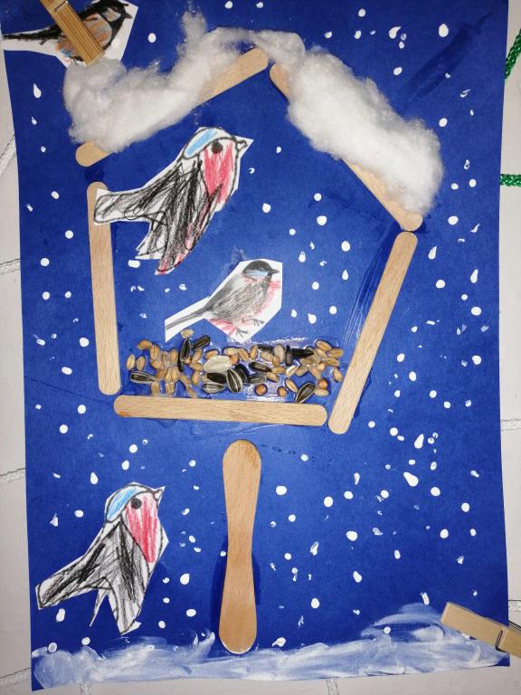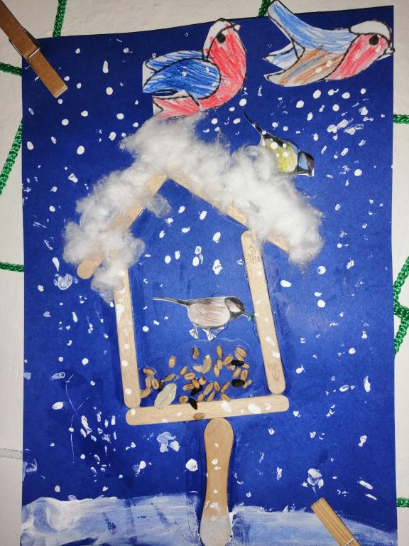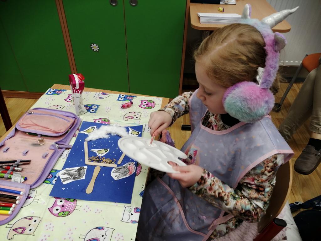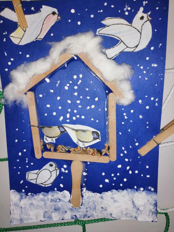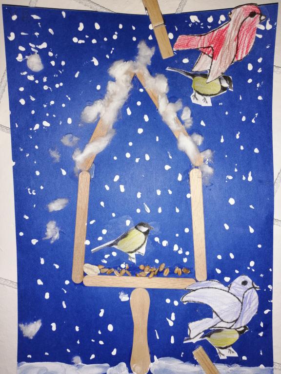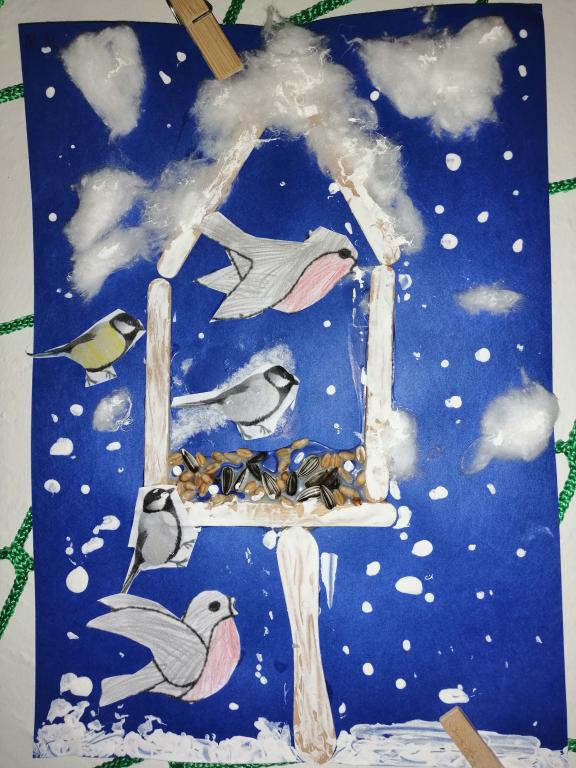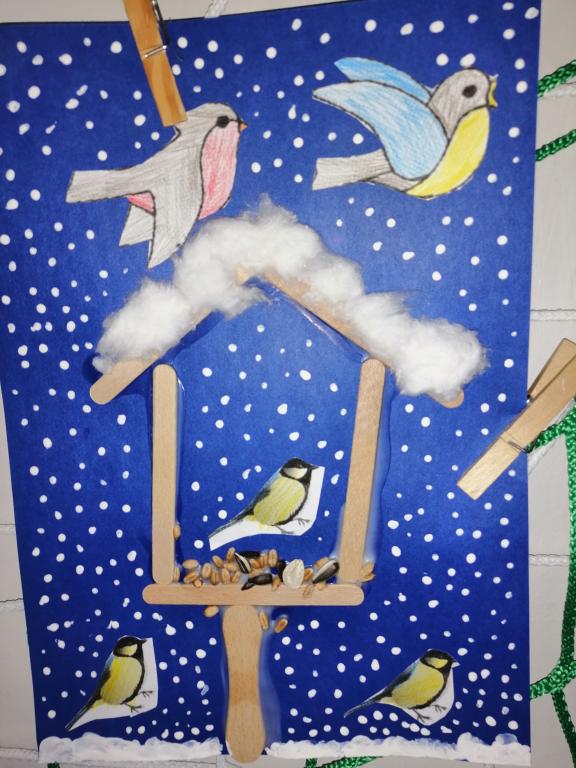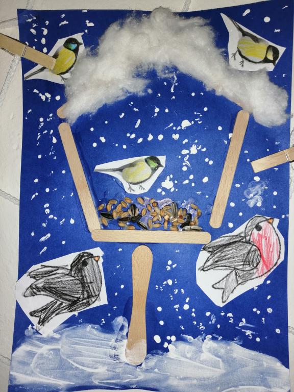 I v následujících dnech jsme si povídali o zvířatech. Na řadě byla ta zvířata, která tu žijí ve volné přírodě v zimě. Zopakovali jsme si ptáky, kteří tu v zimě zůstávají a sledovali jsme je živě přes webkameru. Vyrobili jsme i krmítka, do nichž jsme nezapomněli dát zobání. I o něm jsme si povídali a zkoumali, co všechno je vhodné dát do krmítka. Poslouchali jsme hlasy ptáků a zkoušeli je určovat. Dále jsme se zaměřili na stopy zvířat ve sněhu. Nechyběla ani tematická pohádka O sojce, která nakrmila celý les.