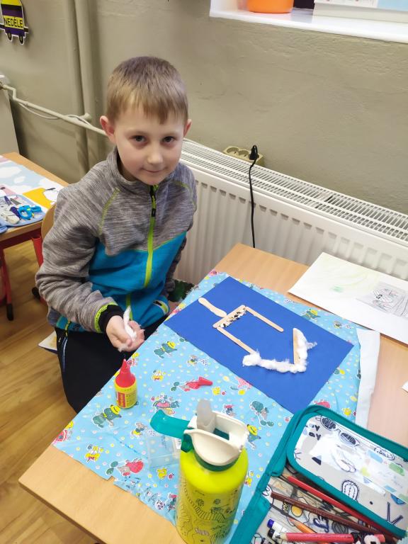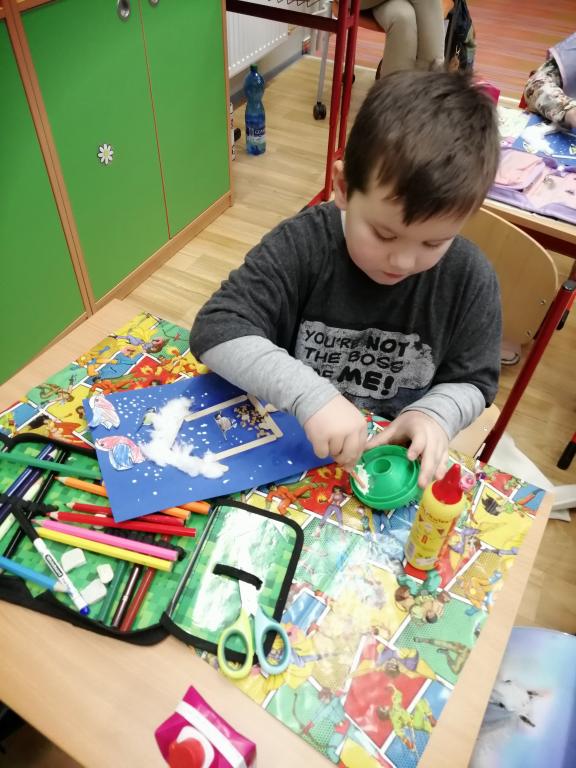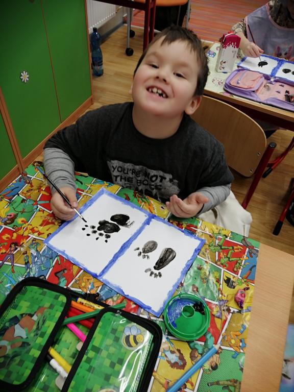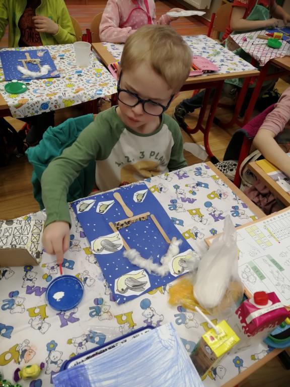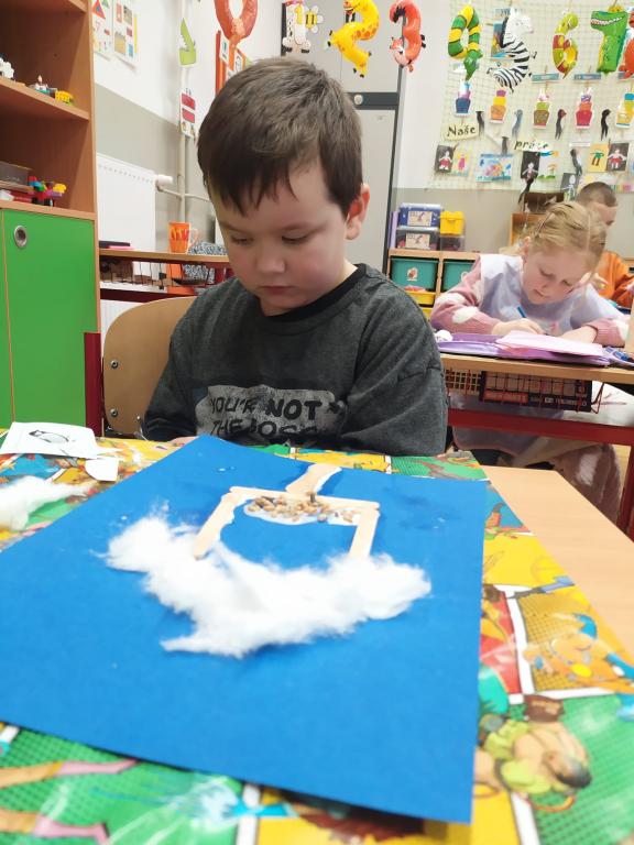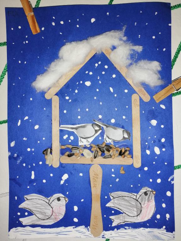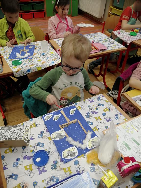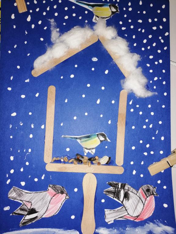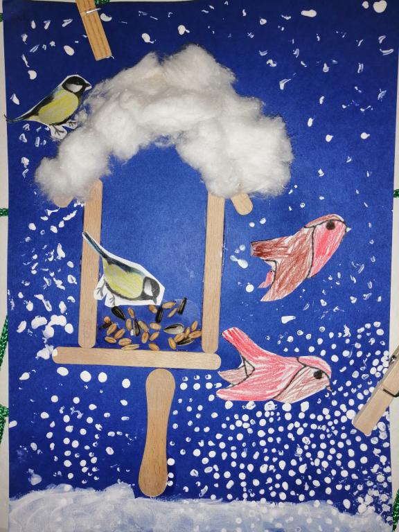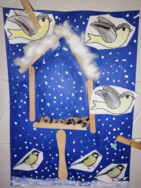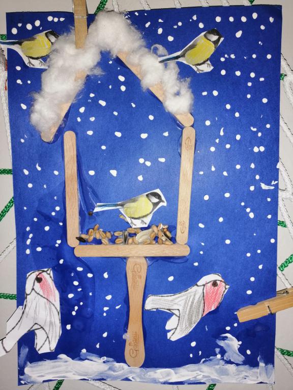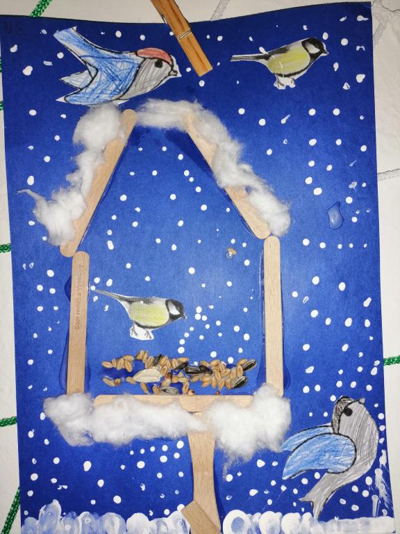 I v následujících dnech jsme si povídali o zvířatech. Na řadě byla ta zvířata, která tu žijí ve volné přírodě v zimě. Zopakovali jsme si ptáky, kteří tu v zimě zůstávají a sledovali jsme je živě přes webkameru. Vyrobili jsme i krmítka, do nichž jsme nezapomněli dát zobání. I o něm jsme si povídali a zkoumali, co všechno je vhodné dát do krmítka. Poslouchali jsme hlasy ptáků a zkoušeli je určovat. Dále jsme se zaměřili na stopy zvířat ve sněhu. Nechyběla ani tematická pohádka O sojce, která nakrmila celý les.
