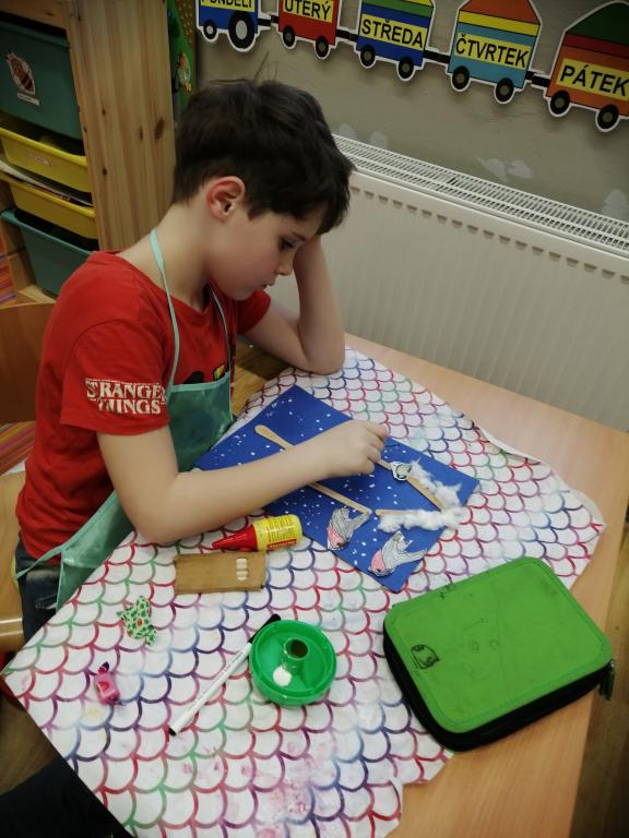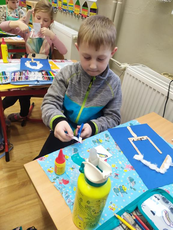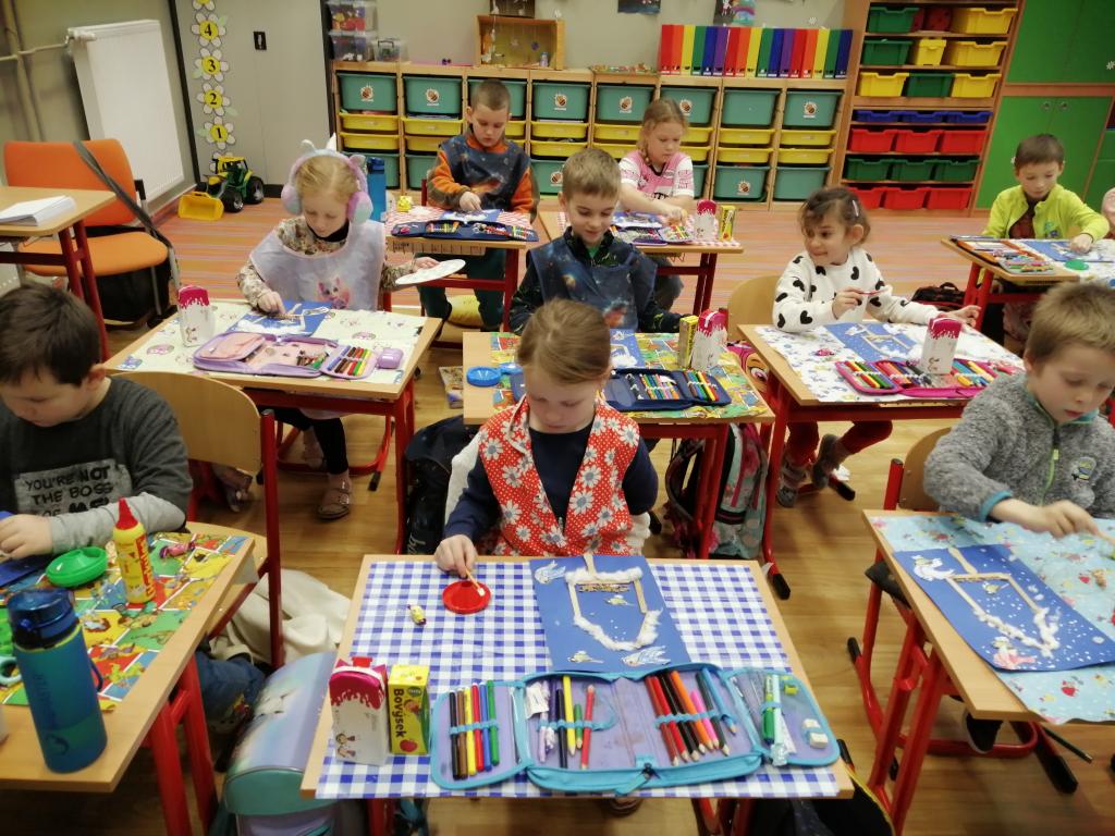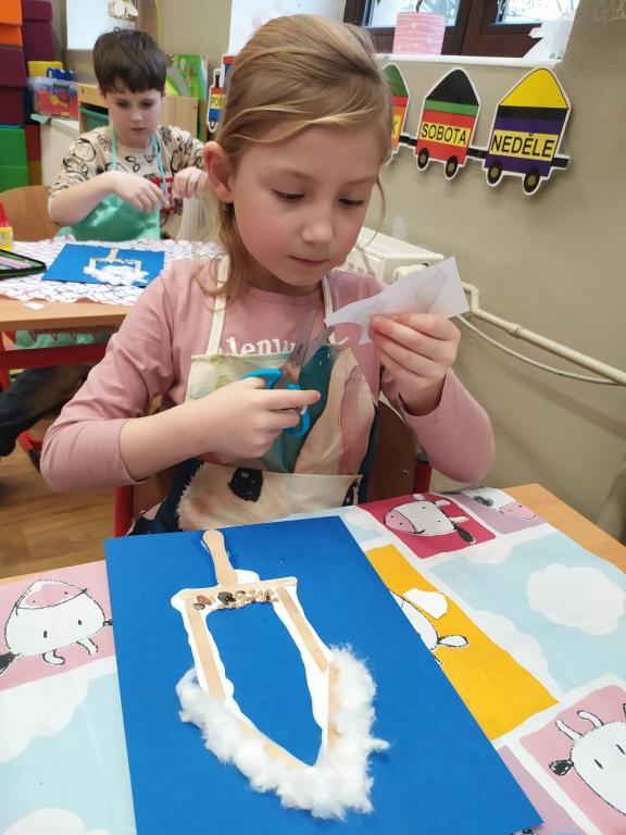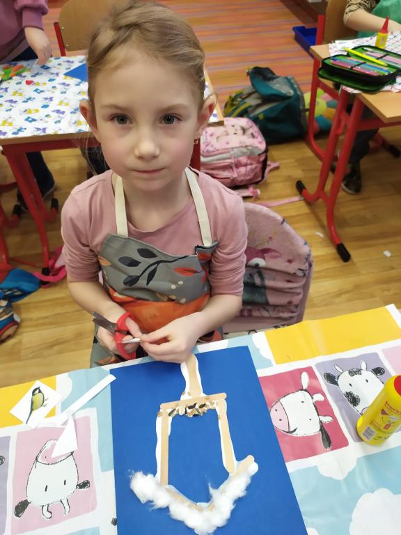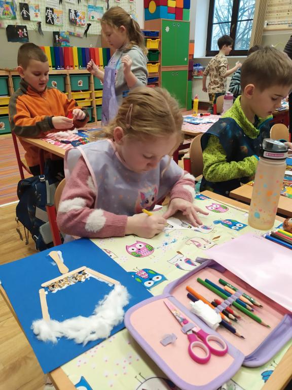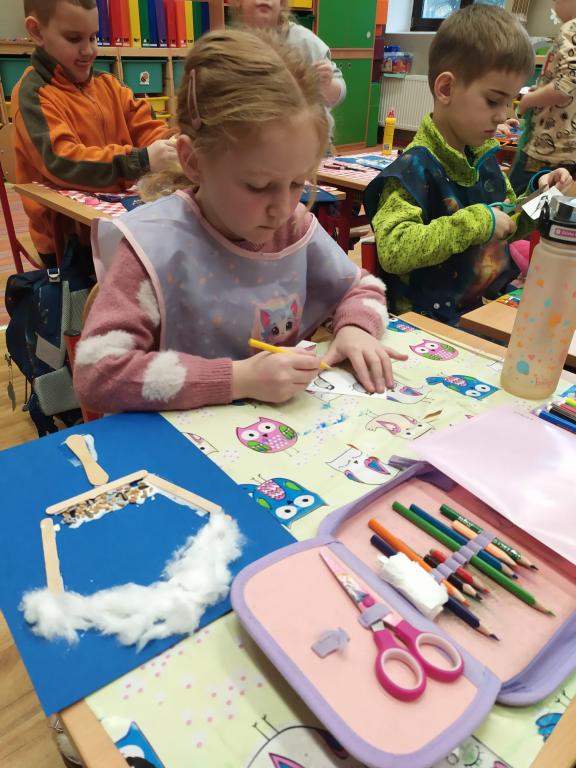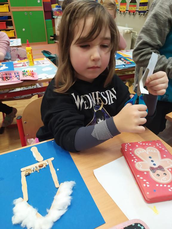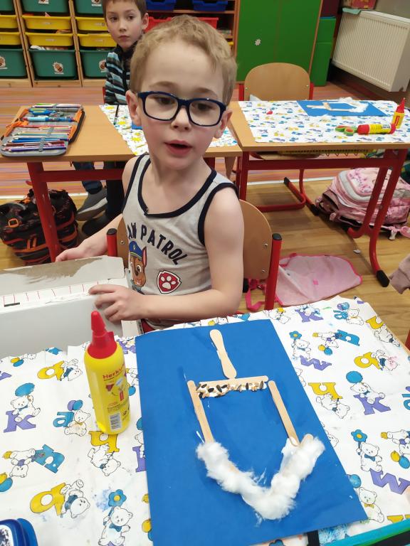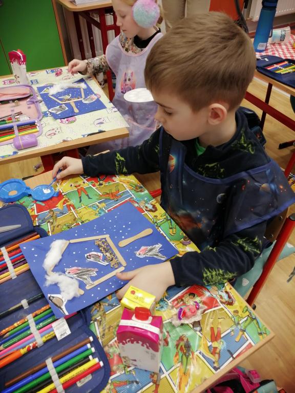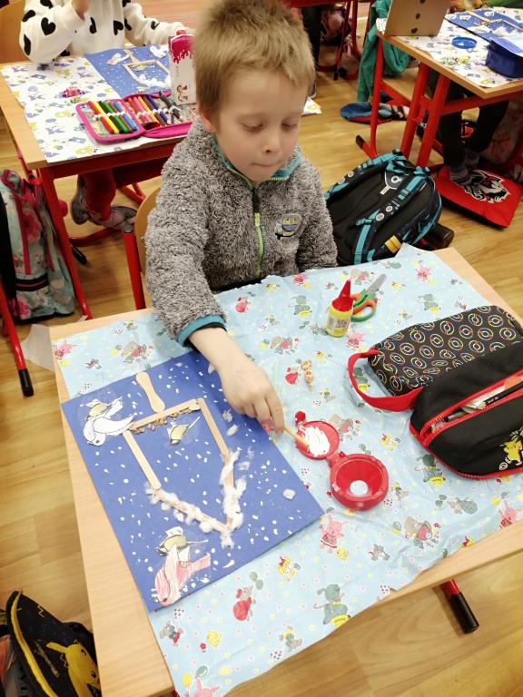 I v následujících dnech jsme si povídali o zvířatech. Na řadě byla ta zvířata, která tu žijí ve volné přírodě v zimě. Zopakovali jsme si ptáky, kteří tu v zimě zůstávají a sledovali jsme je živě přes webkameru. Vyrobili jsme i krmítka, do nichž jsme nezapomněli dát zobání. I o něm jsme si povídali a zkoumali, co všechno je vhodné dát do krmítka. Poslouchali jsme hlasy ptáků a zkoušeli je určovat. Dále jsme se zaměřili na stopy zvířat ve sněhu. Nechyběla ani tematická pohádka O sojce, která nakrmila celý les.