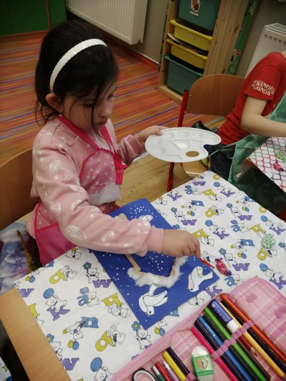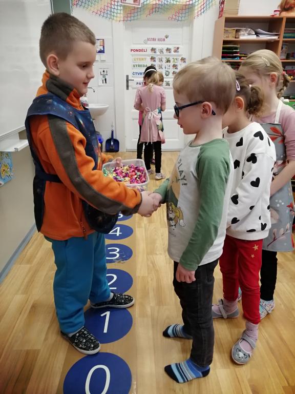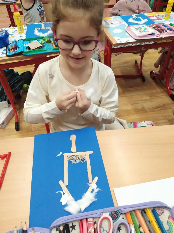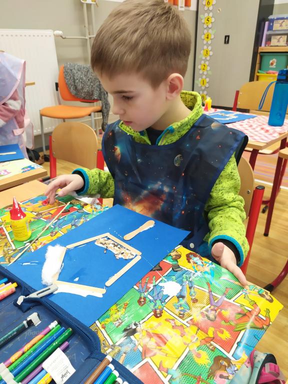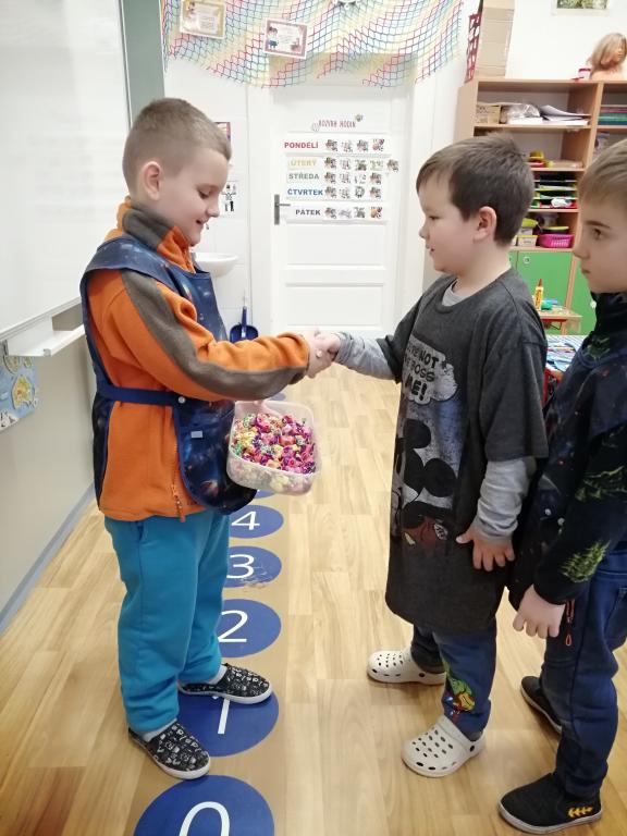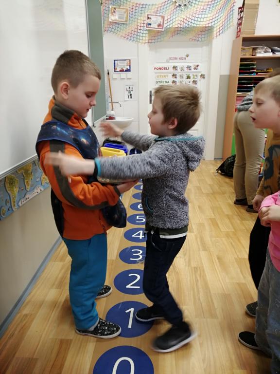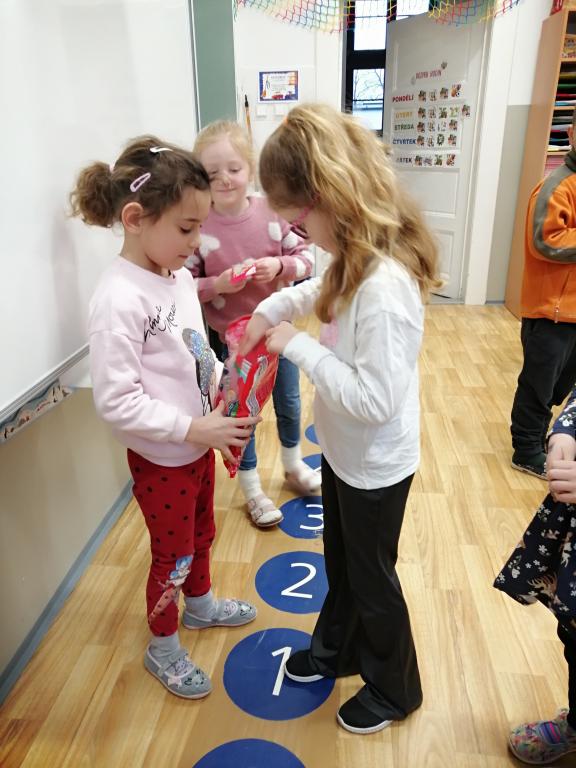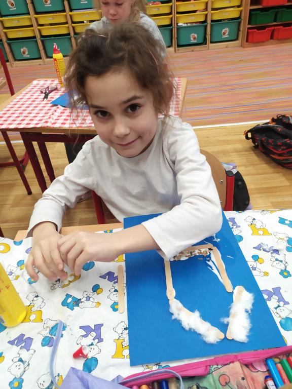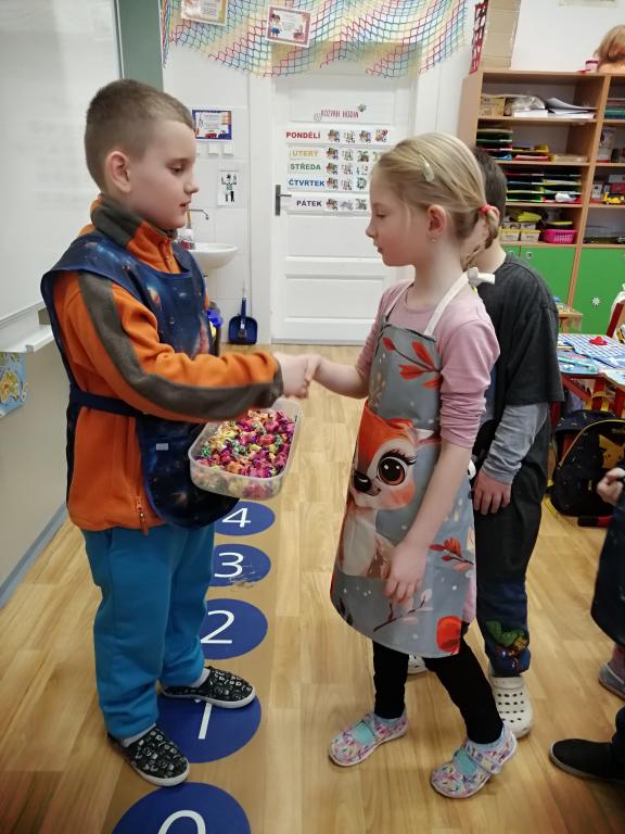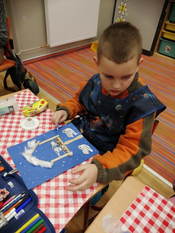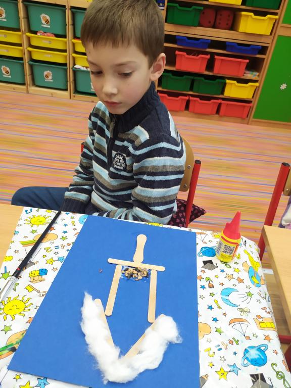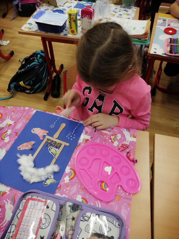 I v následujících dnech jsme si povídali o zvířatech. Na řadě byla ta zvířata, která tu žijí ve volné přírodě v zimě. Zopakovali jsme si ptáky, kteří tu v zimě zůstávají a sledovali jsme je živě přes webkameru. Vyrobili jsme i krmítka, do nichž jsme nezapomněli dát zobání. I o něm jsme si povídali a zkoumali, co všechno je vhodné dát do krmítka. Poslouchali jsme hlasy ptáků a zkoušeli je určovat. Dále jsme se zaměřili na stopy zvířat ve sněhu. Nechyběla ani tematická pohádka O sojce, která nakrmila celý les.