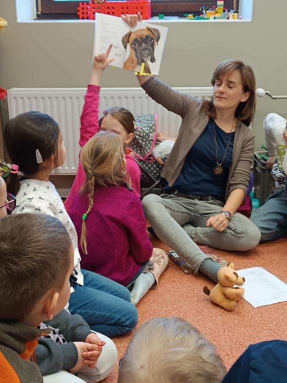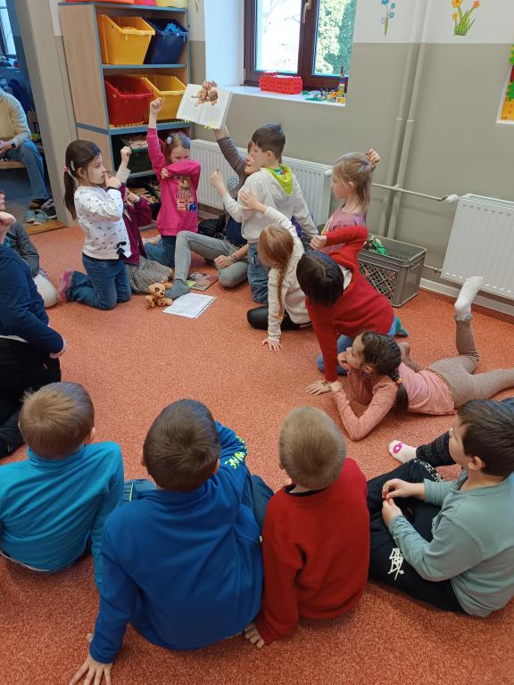 Naši školní družinu navštívila paní knihovnice. Mladším dětem představila různá plemena psů a poté jim přečetla knížku Hledá se pes. Následně děti dostaly úkol, nakreslit buldočkovi do pusy, co má rád k jídlu, nebo jezevčíkovi navrhnout různobarevný svetr.