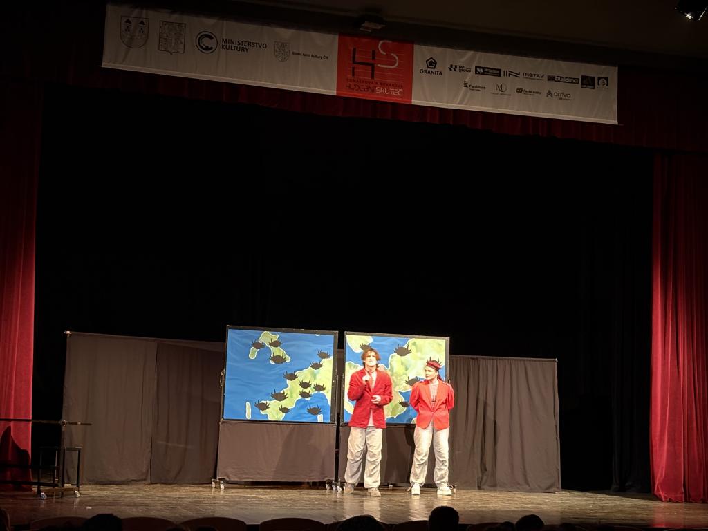 Hey people - anglické divadlo, které jsme měli možnost vidět 1. dubna v kulturním klubu ve Skutči. Jednalo se o příběh volně inspirovaný románem Karla Čapka Válka s mloky. Děti měly možnost rozšířit si slovní zásobu a vyzkoušet si porozumění anglickému jazyku v jiném než školním prostředí. Z reakcí děti: "Bylo to velice hezké a perfektně jsem rozuměla. Lidé jsou zlí k přírodě i k sobě. Líbilo se mi to, jen jsem tomu moc nerozuměl. Smutný příběh. Rozuměla jsem fakt málo, maximálně pár slov. Nemáme týrat zvířata. Zvířata nás mohou ledacos naučit. Moc se mi to líbilo. Rozuměl jsem jen některým větám. Bylo to nejepší divadlo, co jsem kdy viděla. Šlo tomu hodně moc rozumět. Líbilo se mi to. Neměli bychom si z nikoho dělat otroky. Líbilo se mi to. Ten příběh byl moc dobrý." Nováková Ivana