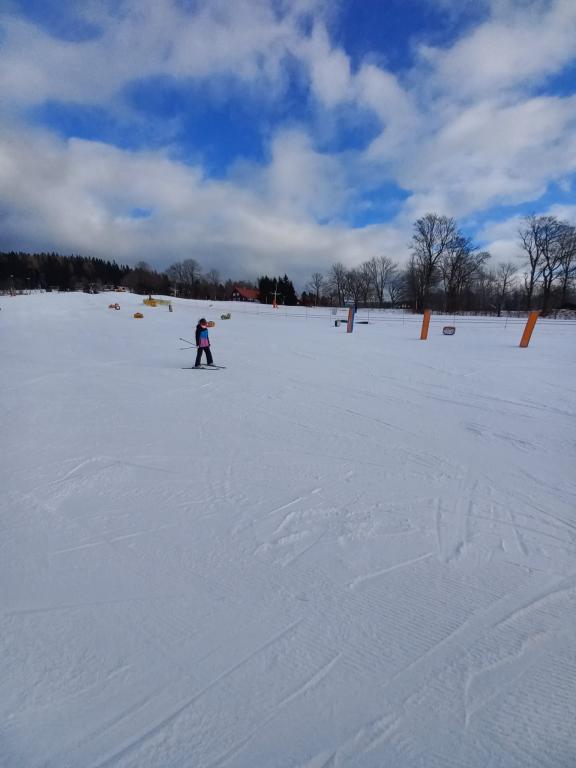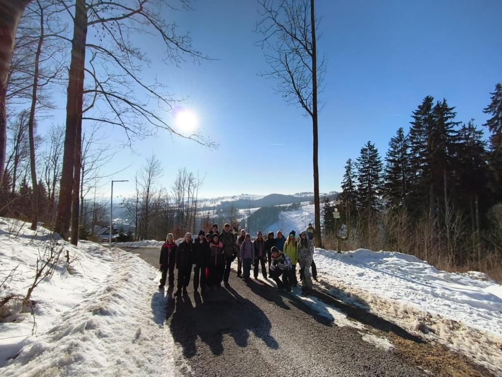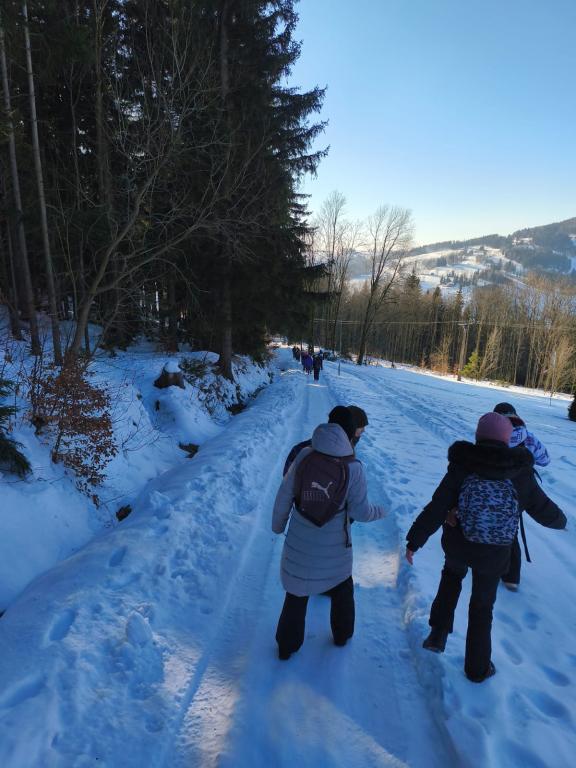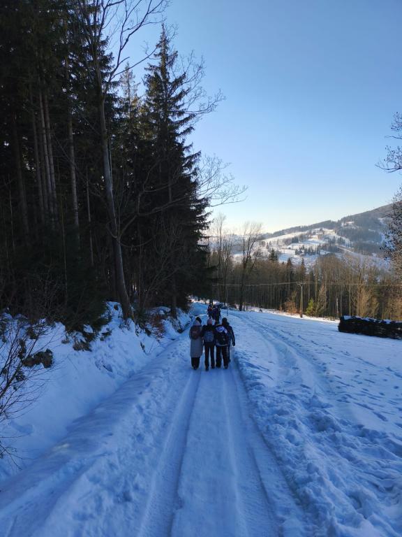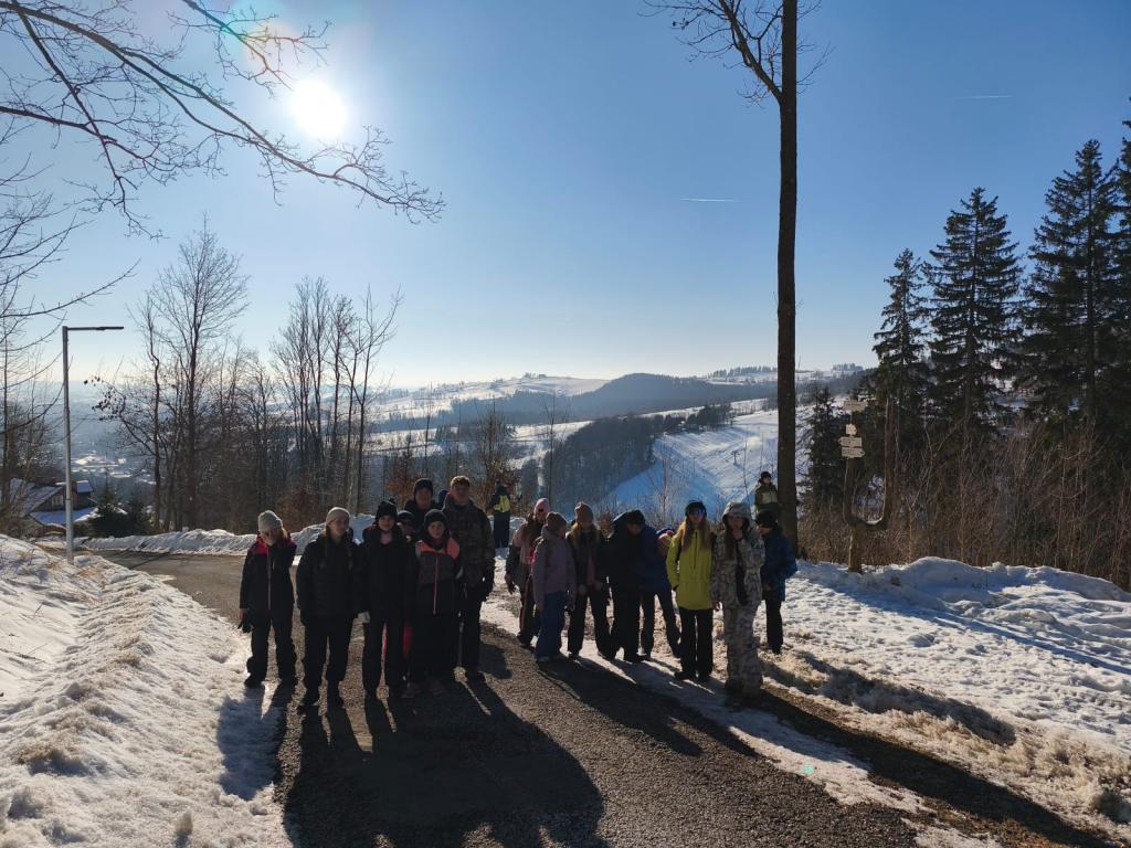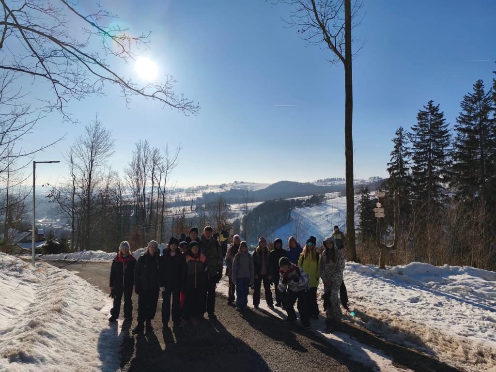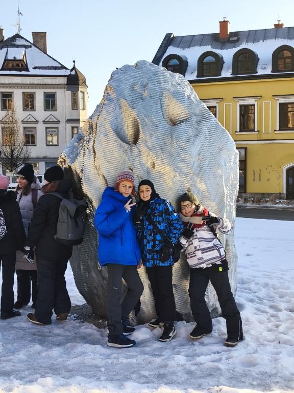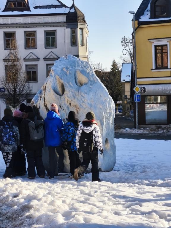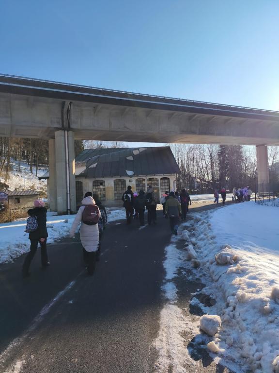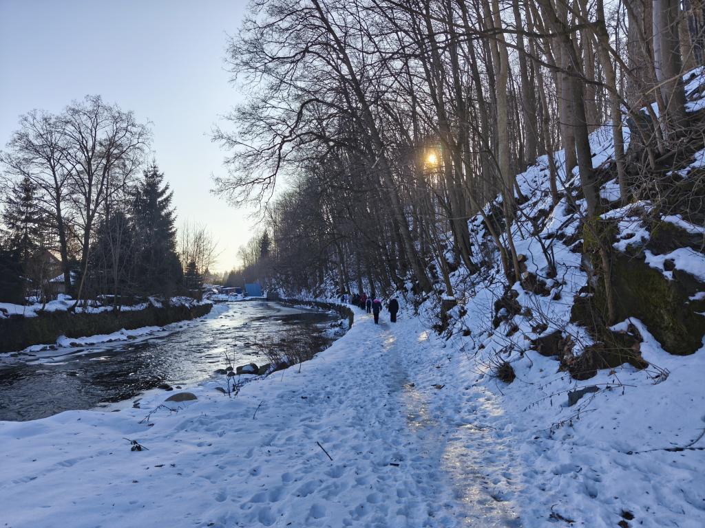 Po obědě jsme lyžáky vyměnili za pohorky a vyrazili na zasloužený „odpočinkový“ výlet do Vrchlabí. Zvolili jsme turistickou trasu, která nás vedla skrz tiché zasněžené lesy, přes kopce s výhledy do kraje a podél zurčícího potoka. Příroda v okolí je momentálně jako z pohádky a čerstvý vzduch nám vyčistil hlavy.