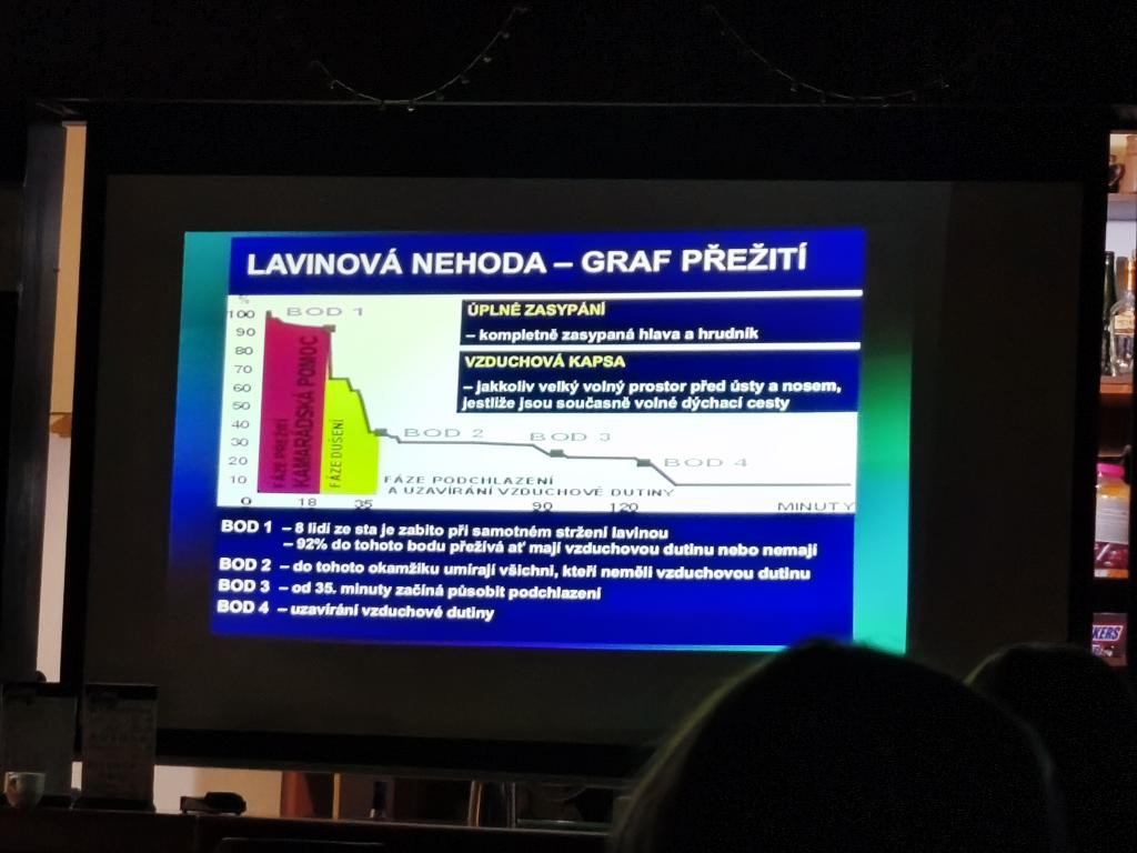 Na závěr nám pustil sérii videí, která byla sice občas úsměvná, ale především nesmírně poučná. Viděli jsme, jak předvídat nebezpečné situace dříve, než nastanou a jak snadno může neopatrný lyžař v nechráněném terénu strhnout lavinu.