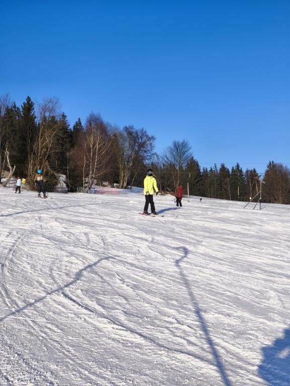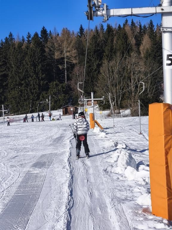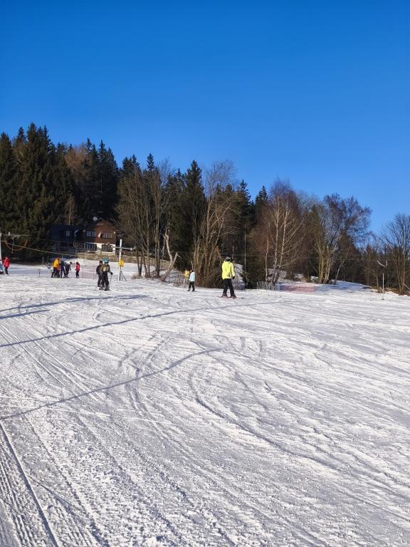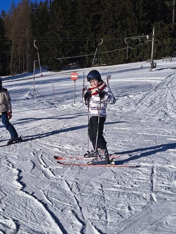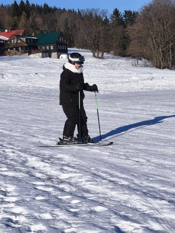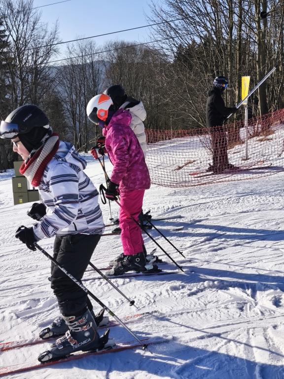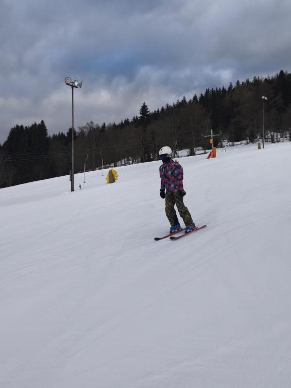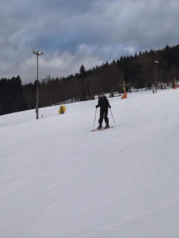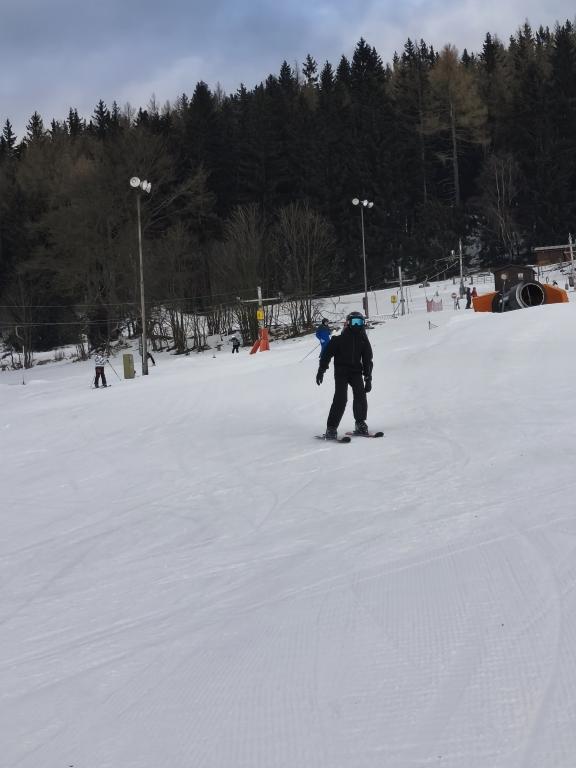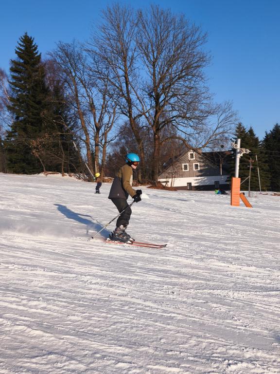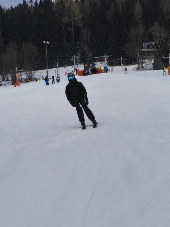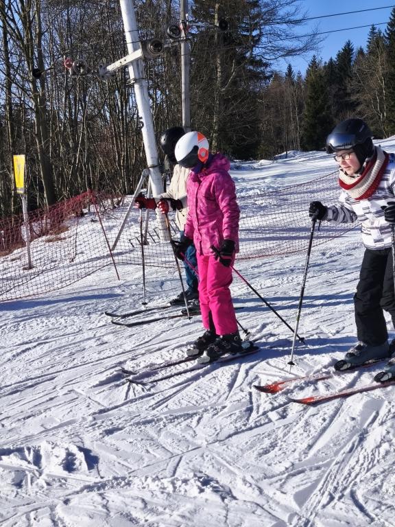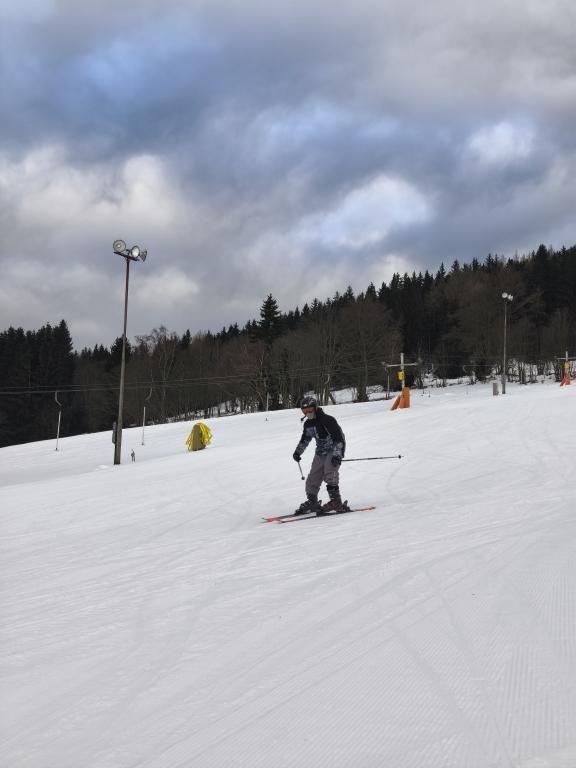 Dnes jsme se navíc přesunuli do nového terénu. Žáci se rozdělili podle svých schopností a odvahy na dvě sjezdovky: