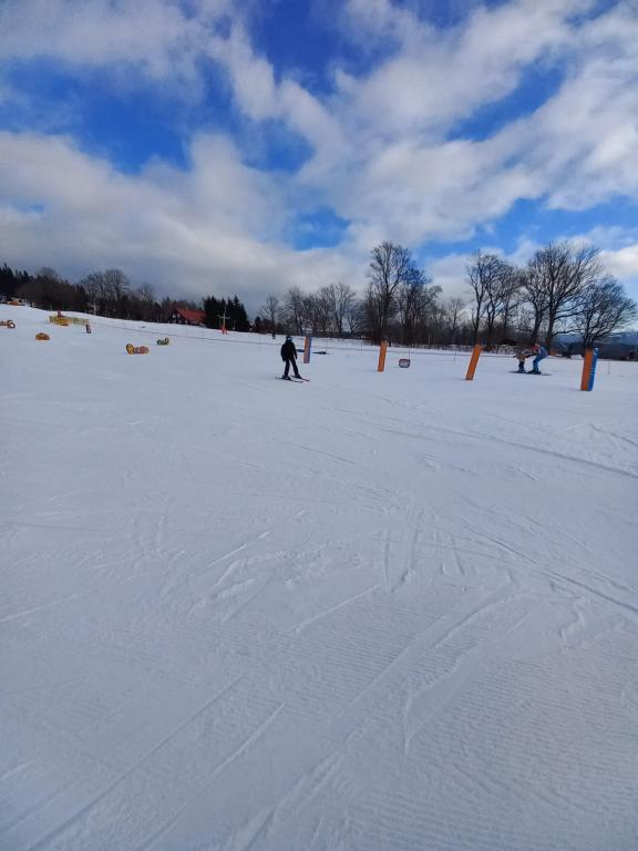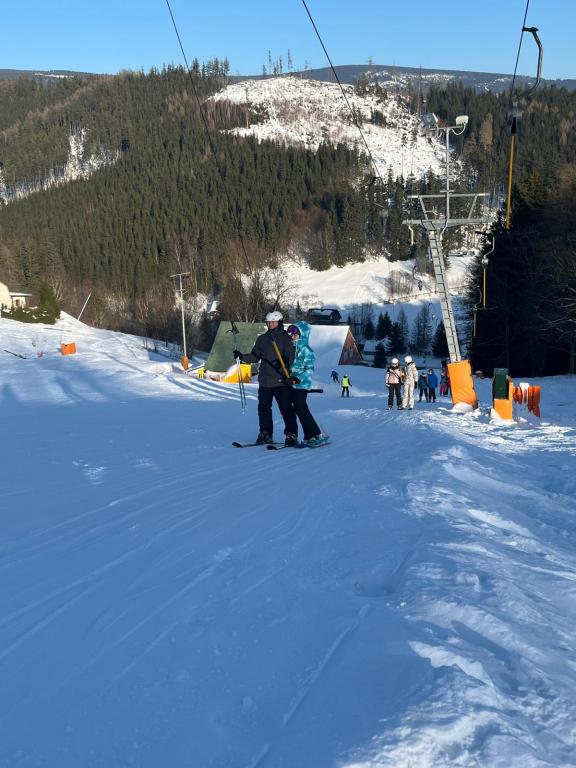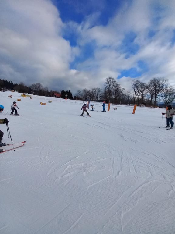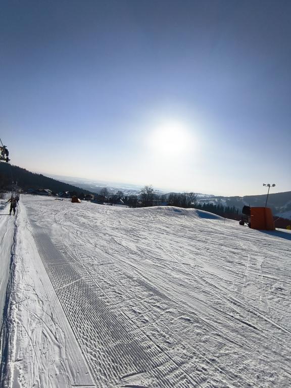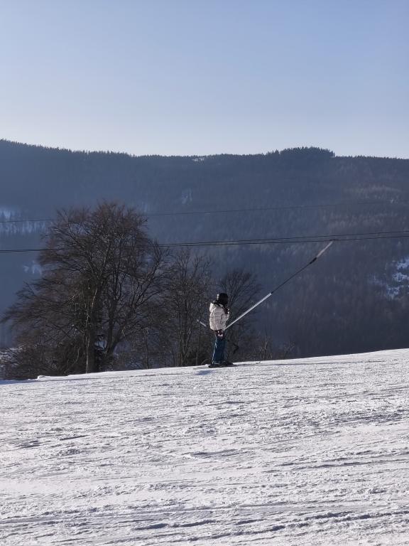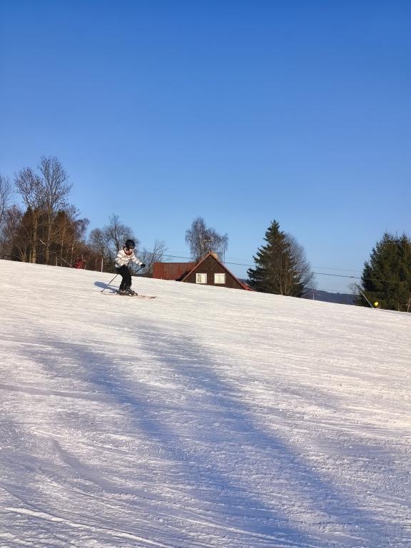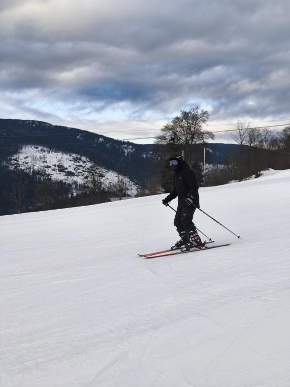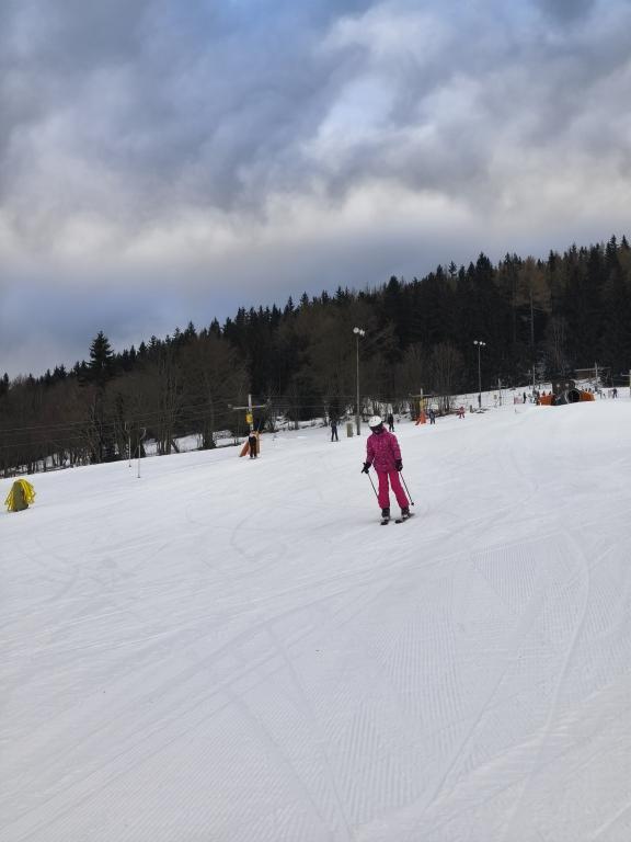 Červená sjezdovka: Pro zkušenější lyžaře byla výzvou strmější stěna, kde se učili kontrolovat rychlost a nebát se náročnějšího sklonu.