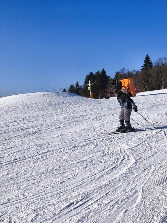 Od samého rána nás provázelo ostré horské sluníčko a „azuro“, které okamžitě zvedlo náladu v celém týmu. Nízké teploty v noci umožnily zasněžování, takže nás na svahu čekal čerstvý technický sníh, který pod lyžemi krásně křupal a držel.