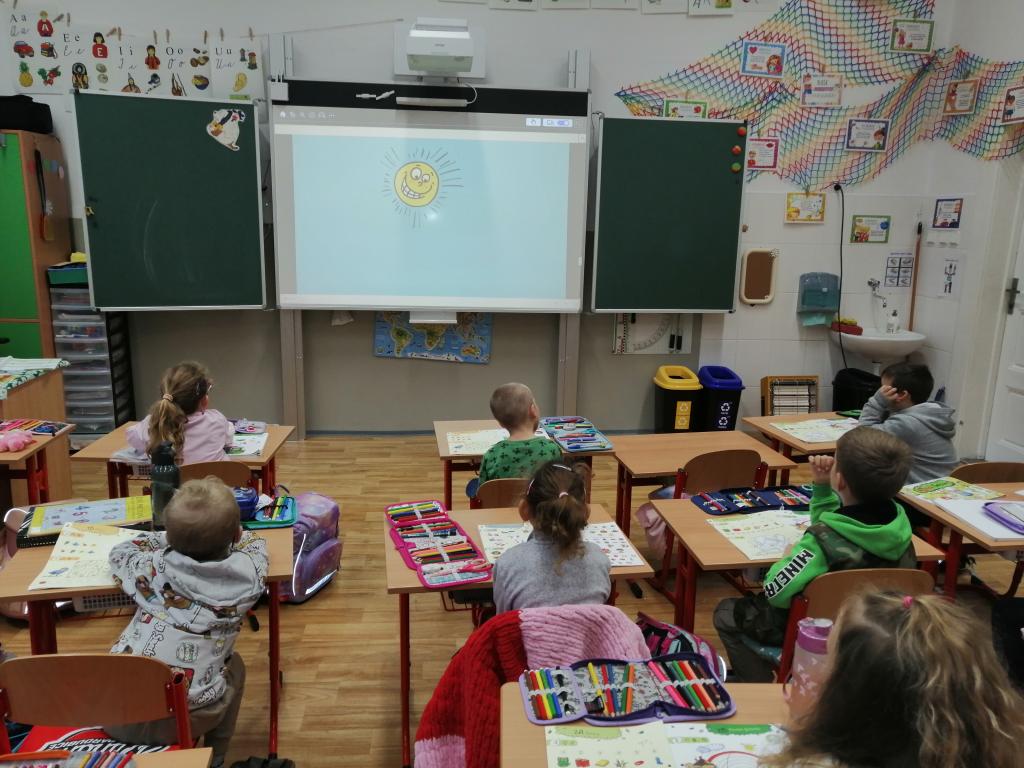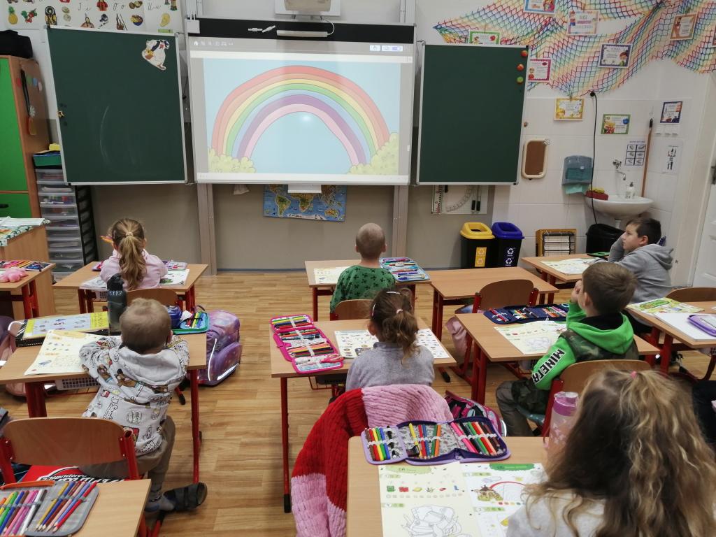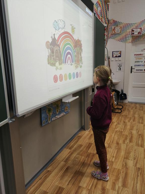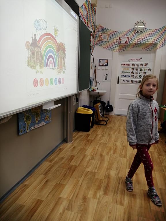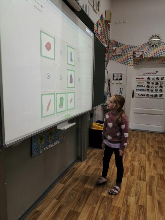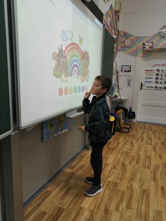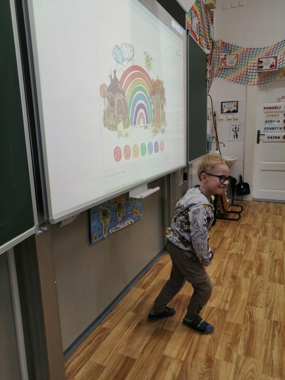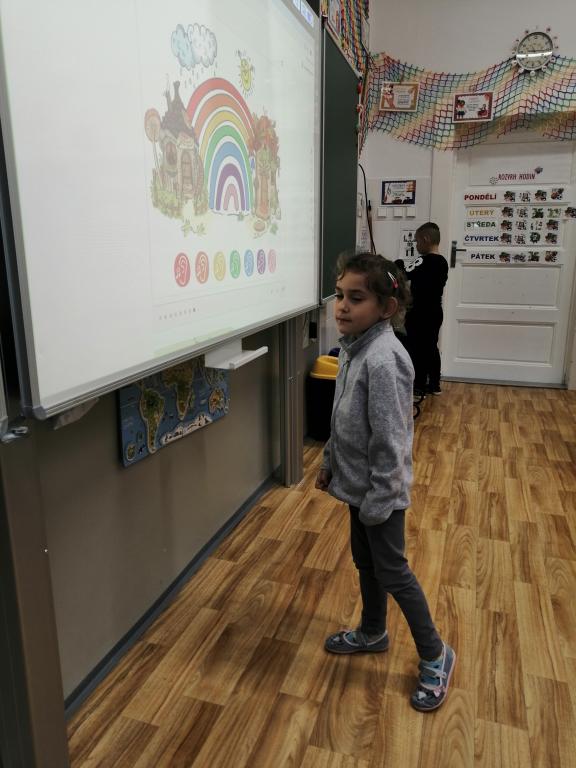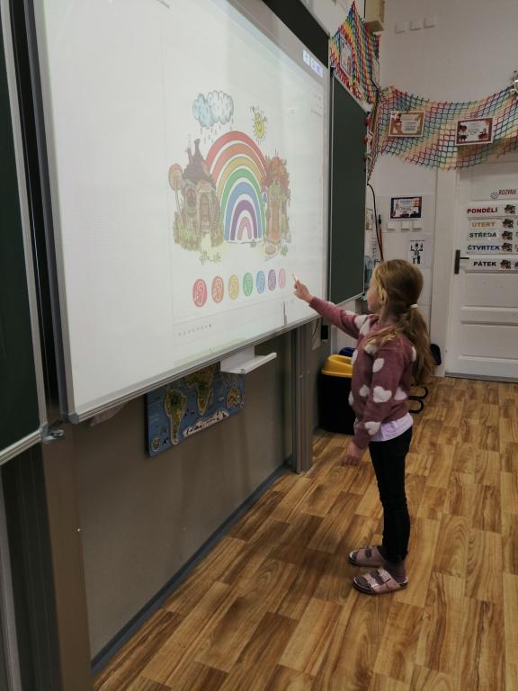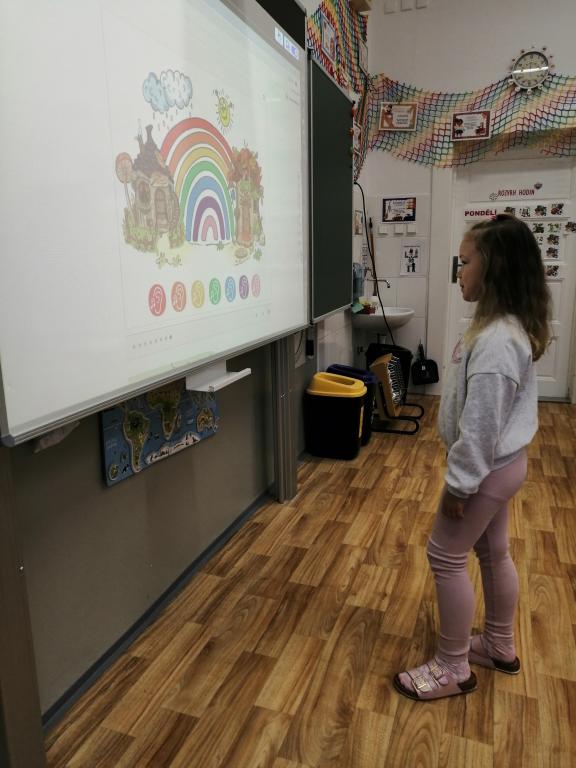 Nadále trénujeme čtení, psaní i počítání. V angličtině procvičujeme barvy. Ve všem nám pomáhá i interaktivní tabule.