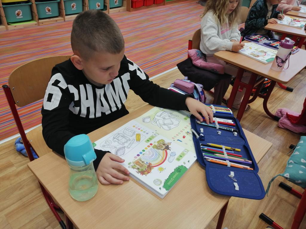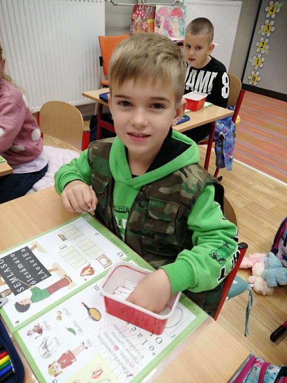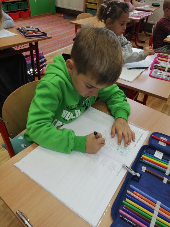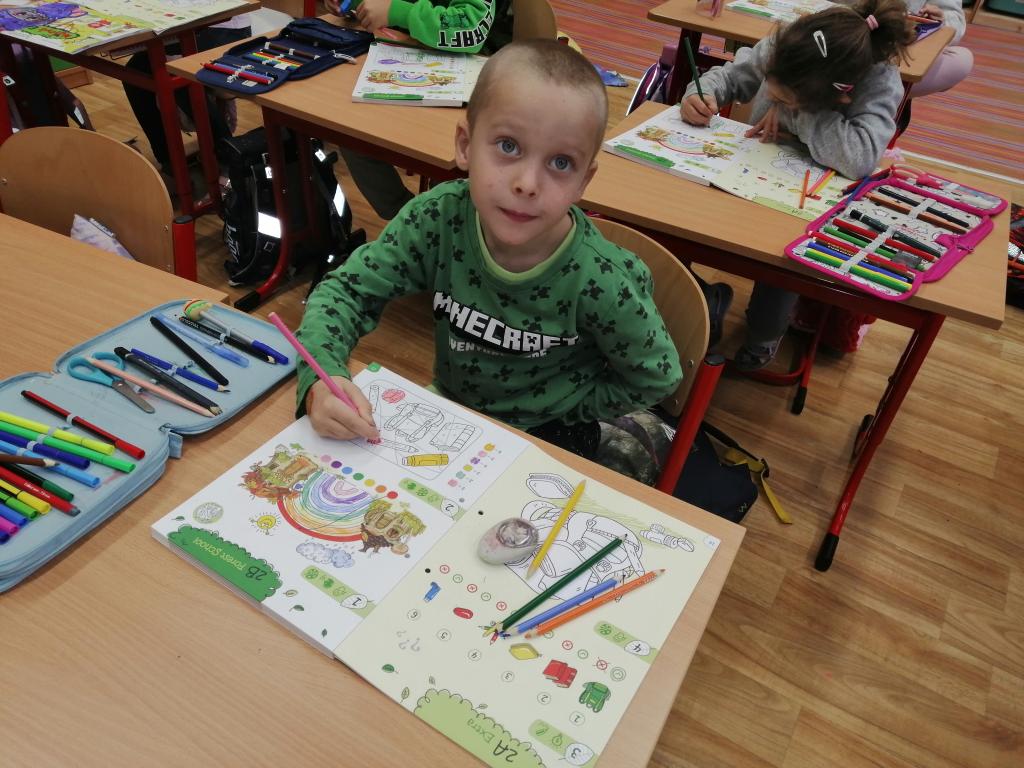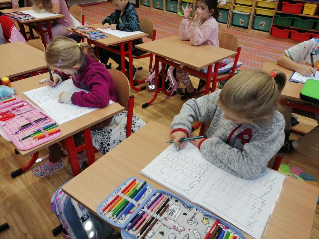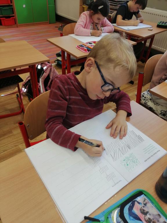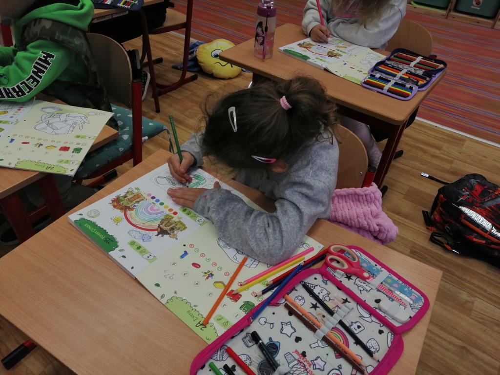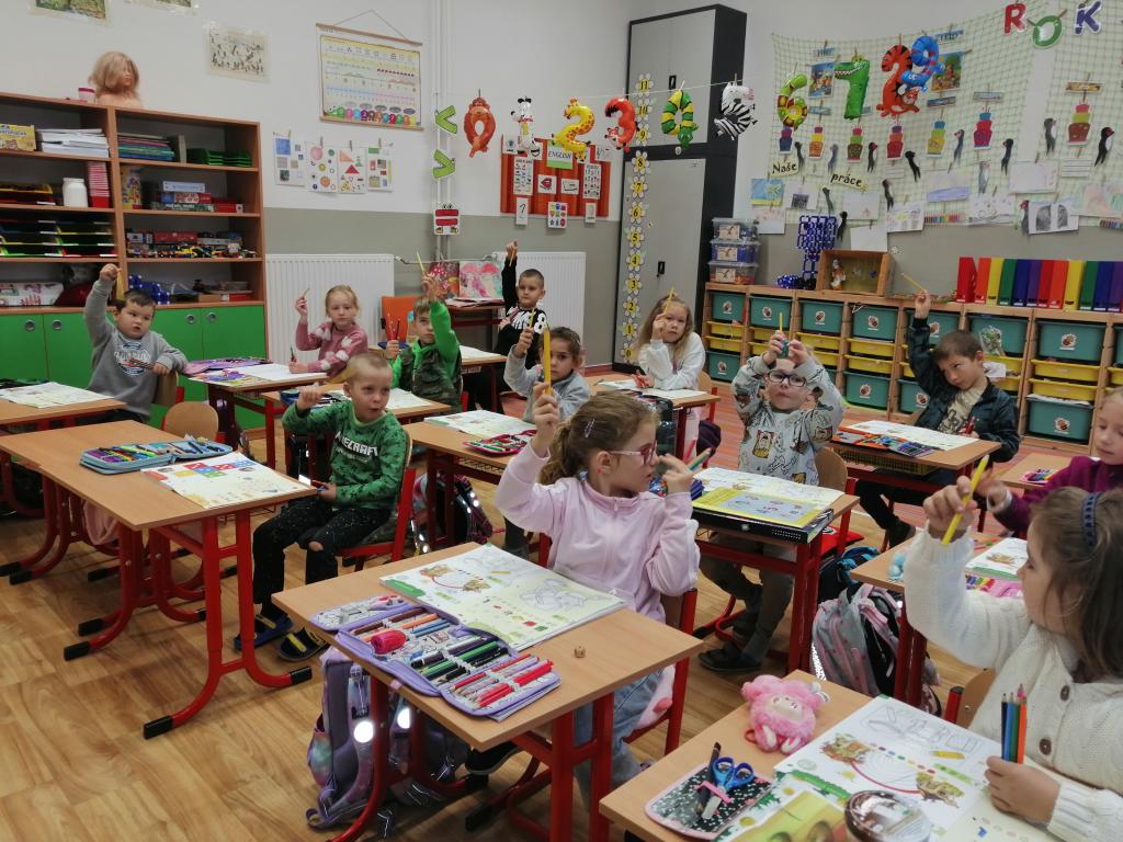 Nadále trénujeme čtení, psaní i počítání. V angličtině procvičujeme barvy. Ve všem nám pomáhá i interaktivní tabule.