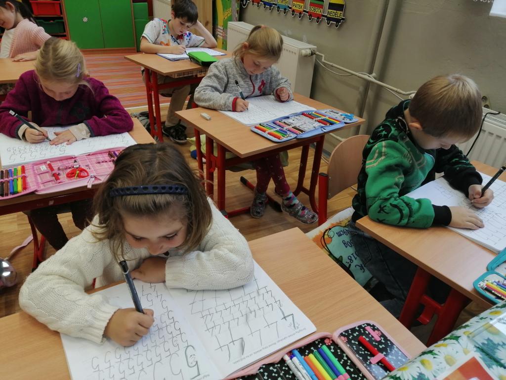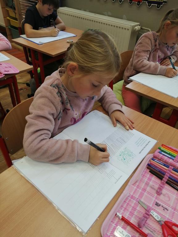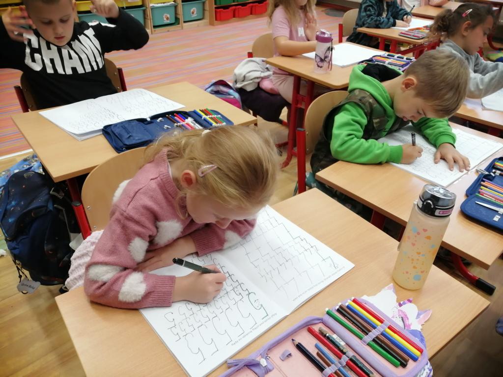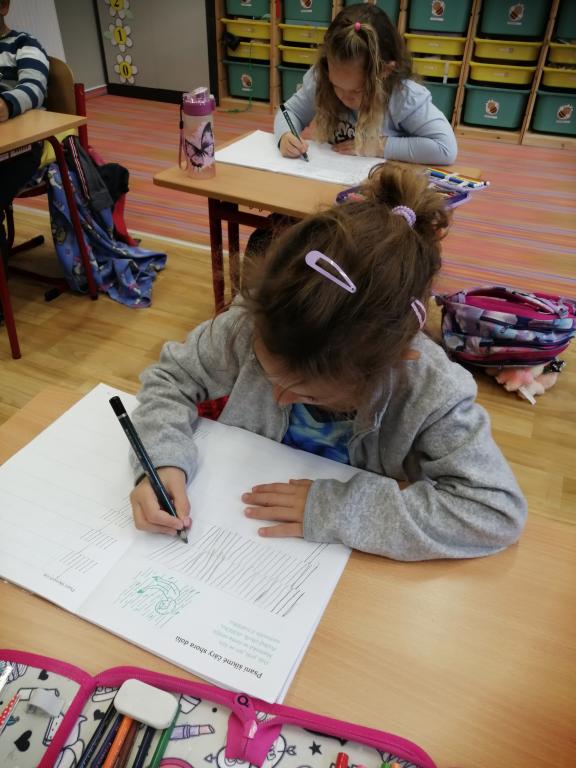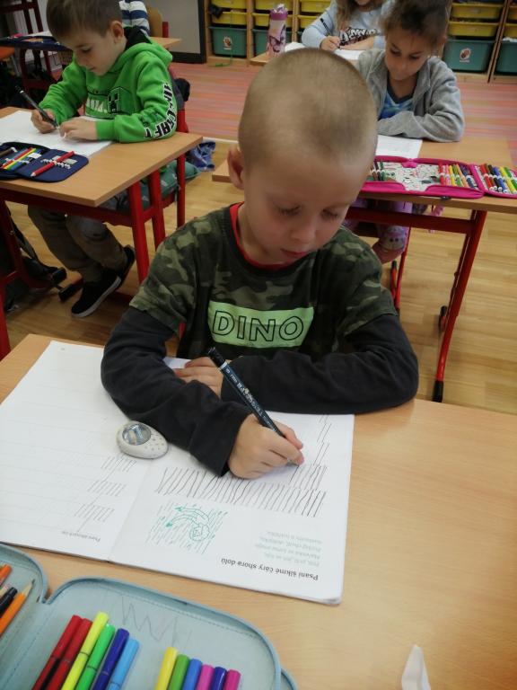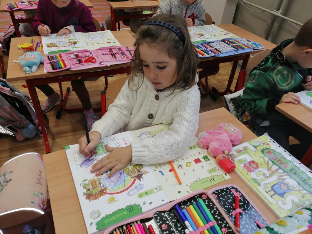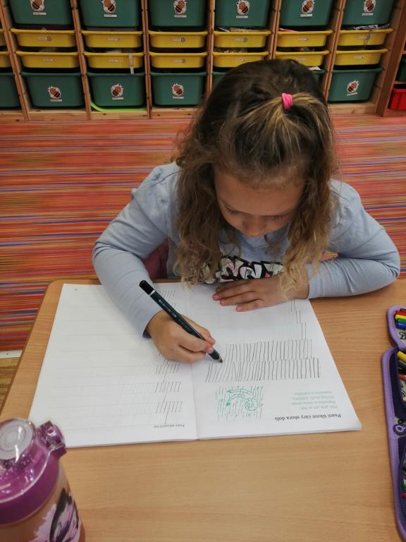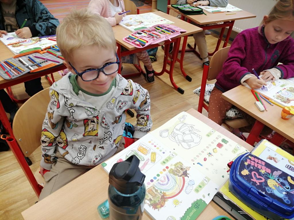 Nadále trénujeme čtení, psaní i počítání. V angličtině procvičujeme barvy. Ve všem nám pomáhá i interaktivní tabule.